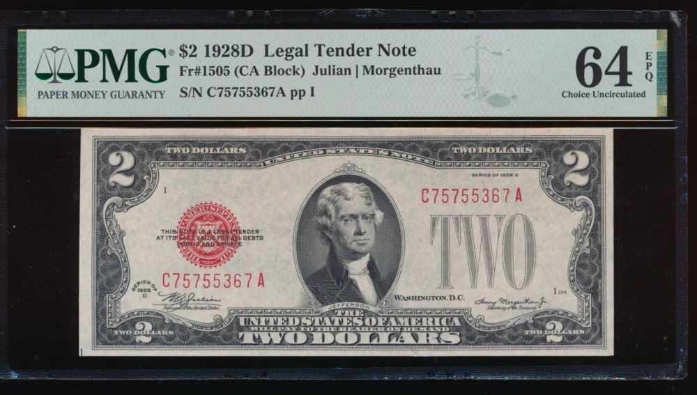 One 1928D $2 Legal Tender Note PMG 64EPQ.