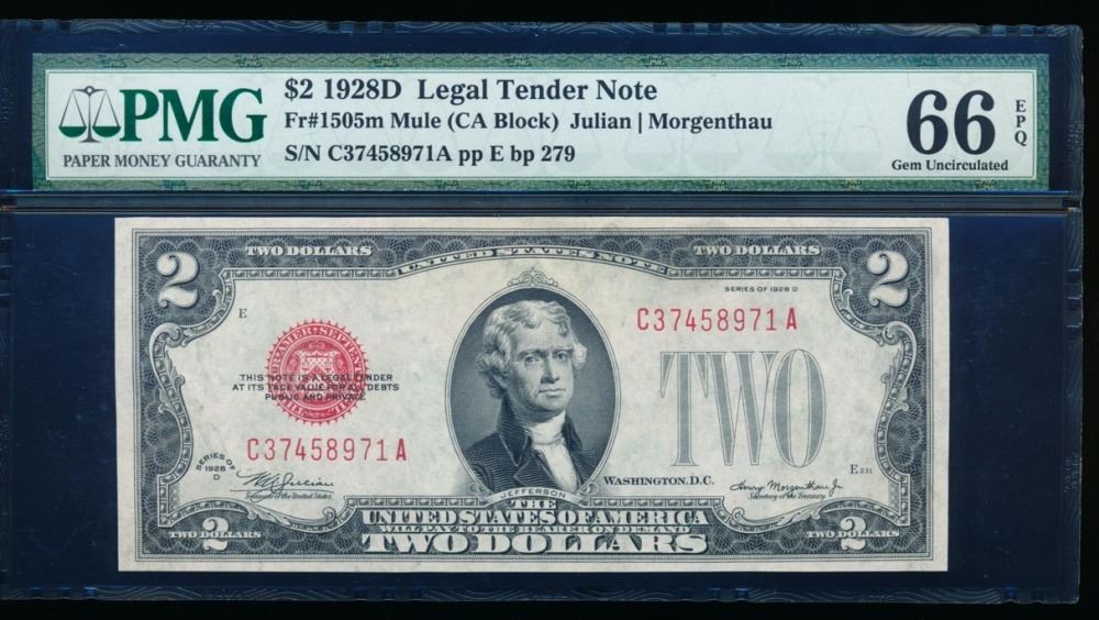 One 1928D $2 Legal Tender Note PMG 66EPQ.