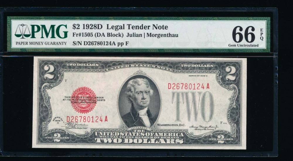 One 1928D $2 Legal Tender Note PMG 66EPQ.