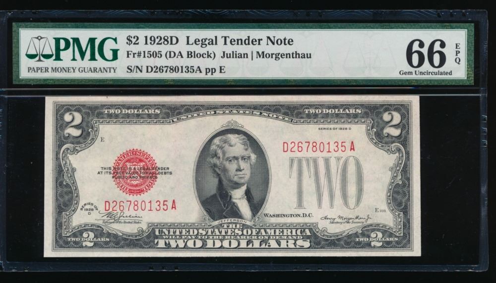 One 1928D $2 Legal Tender Note PMG 66EPQ.