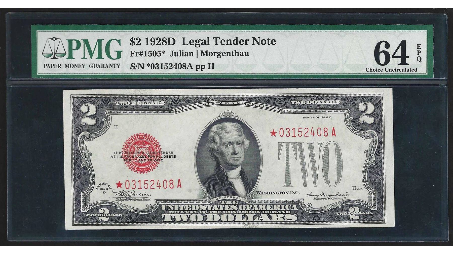 One 1928D $2 Legal Tender STAR Note Fr.1505 PMG Choice Uncirculated 64EPQ. PMG Certified.