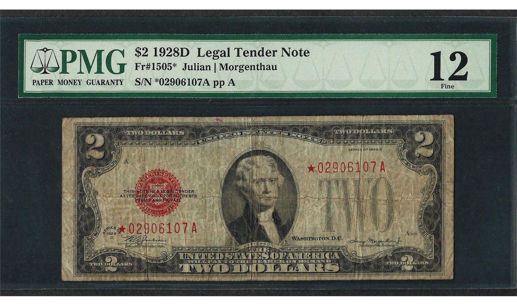 One 1928D $2 Legal Tender STAR Note Fr.1505* PMG Fine 12. PMG Certified.