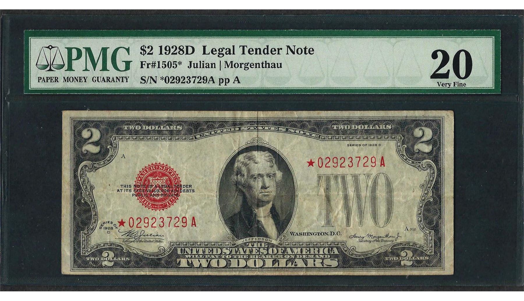 One 1928D $2 Legal Tender STAR Note Fr.1505* PMG Very Fine 20. PMG Certified.