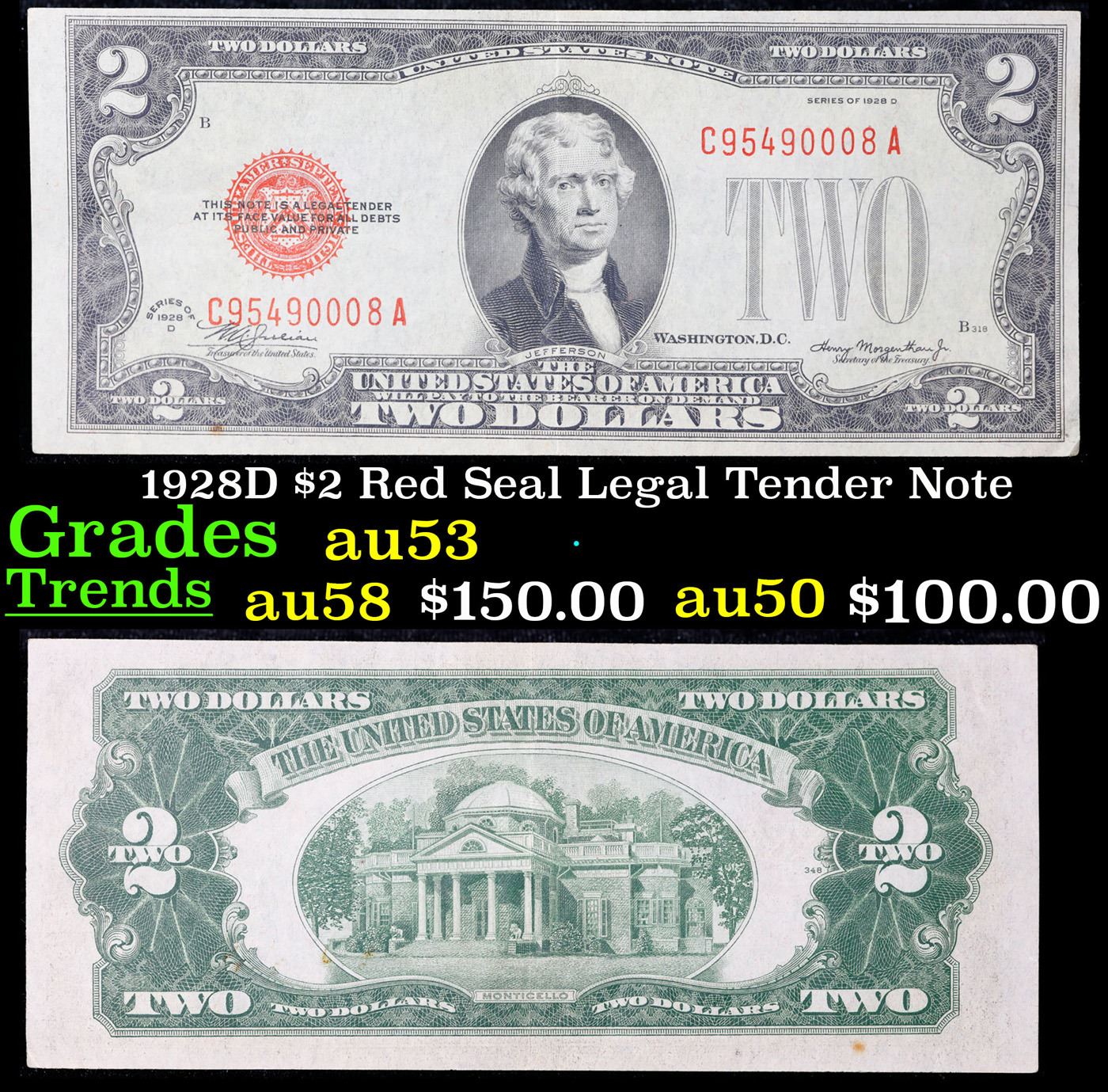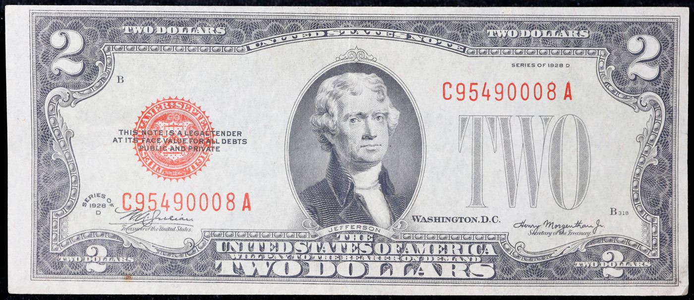 1928D $2 Red Seal Legal Tender Note Grades Select AU.