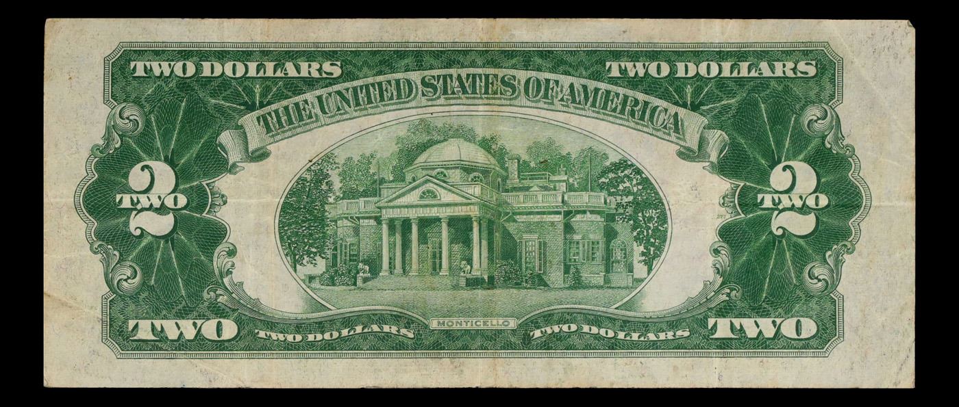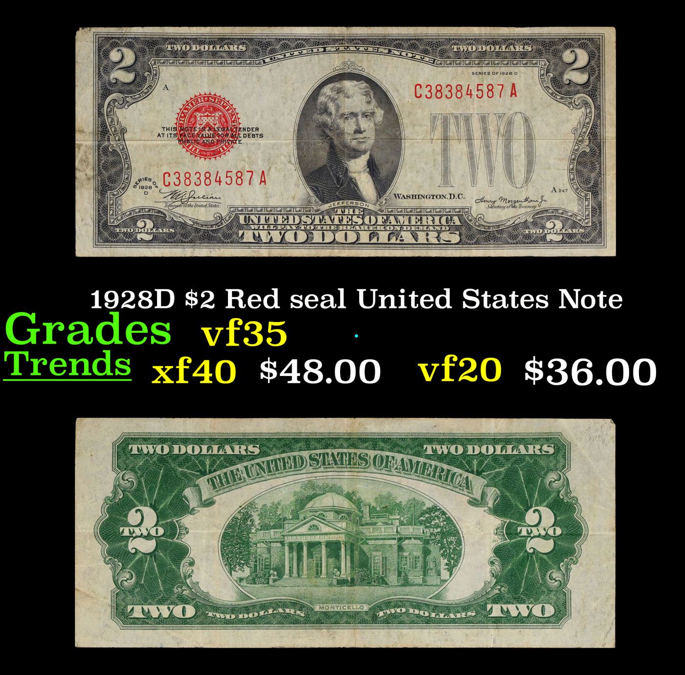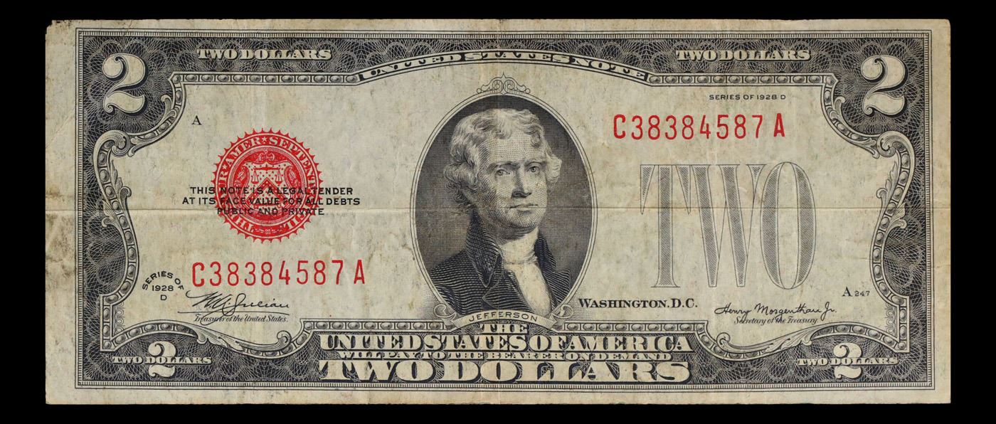1928D $2 Red seal United States Note Grades vf++. This is the first “small size” two dollar bill issued by The U.S. In 1928 the size of paper money was changed to the size that we are familiar with today. There are eight different types of 1928 $2 bills. They are Series of 1928, Series of 1928A, 1928B, 1928C, 1928D, 1928E, 1928F, and 1928G. Series of 1928D $2 bills were printed in the later period between January 1934 and July 1944. These dates coincide with when Henry Morgenthau Jr. and WA Julian were in office together. Like all red seal two dollar legal tender notes, the series of 1928D $2 notes features Thomas Jefferson on the front and Monticello on the back.