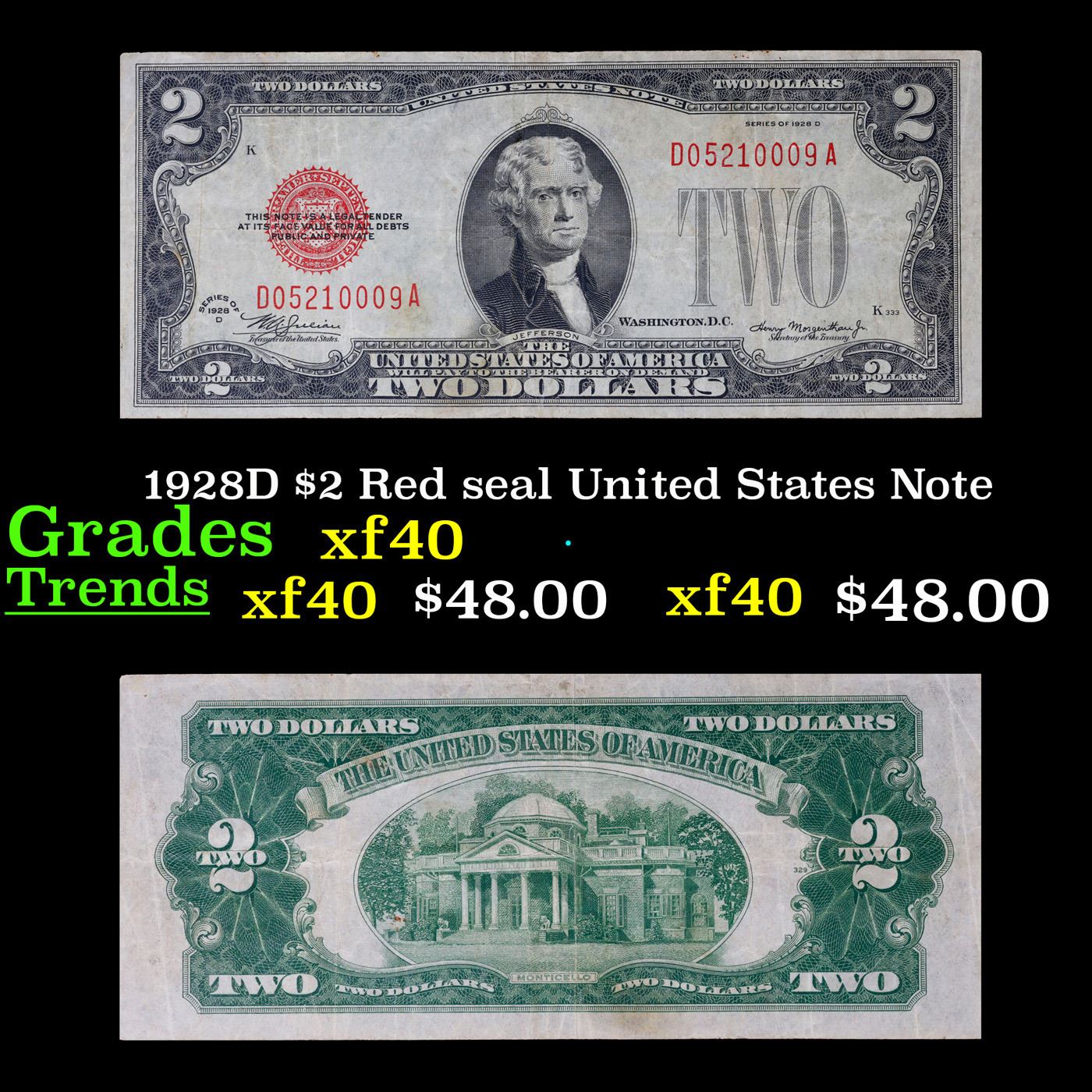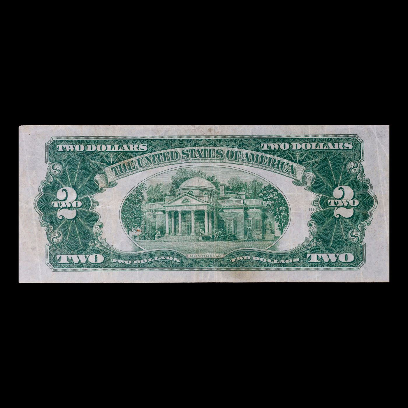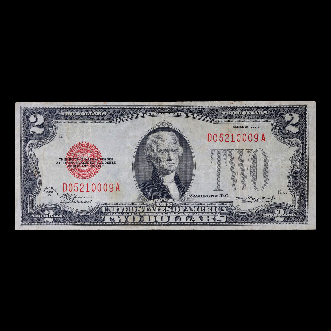 1928D $2 Red seal United States Note Grades xf. This is the first “small size” two dollar bill issued by The U.S. In 1928 the size of paper money was changed to the size that we are familiar with today. There are eight different types of 1928 $2 bills. They are Series of 1928, Series of 1928A, 1928B, 1928C, 1928D, 1928E, 1928F, and 1928G. Series of 1928D $2 bills were printed in the later period between January 1934 and July 1944. These dates coincide with when Henry Morgenthau Jr. and WA Julian were in office together. Like all red seal two dollar legal tender notes, the series of 1928D $2 notes features Thomas Jefferson on the front and Monticello on the back.