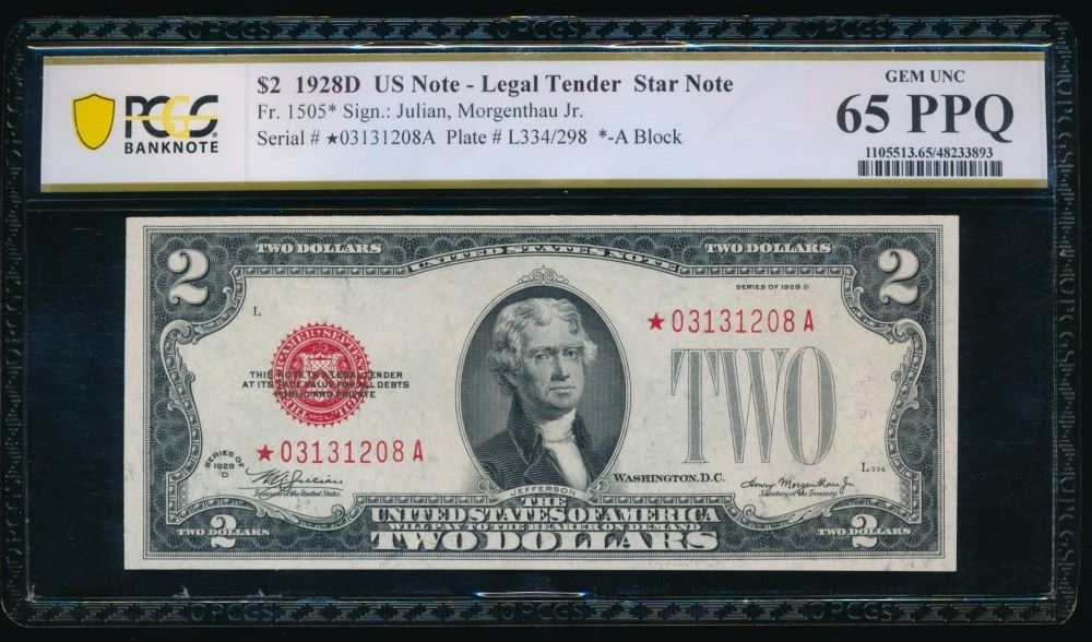 One 1928D $2 STAR Legal Tender Note PCGS 65PPQ.