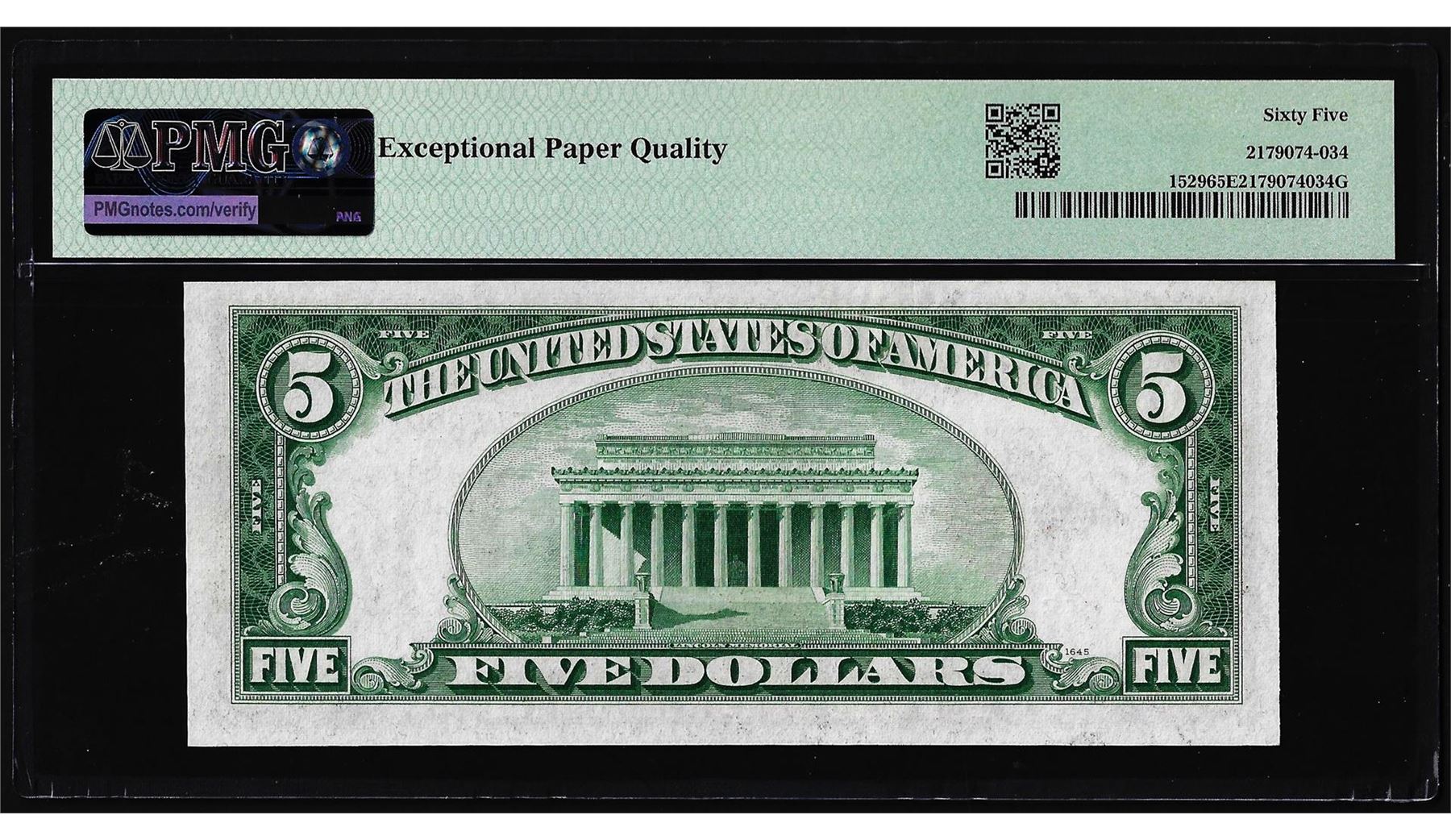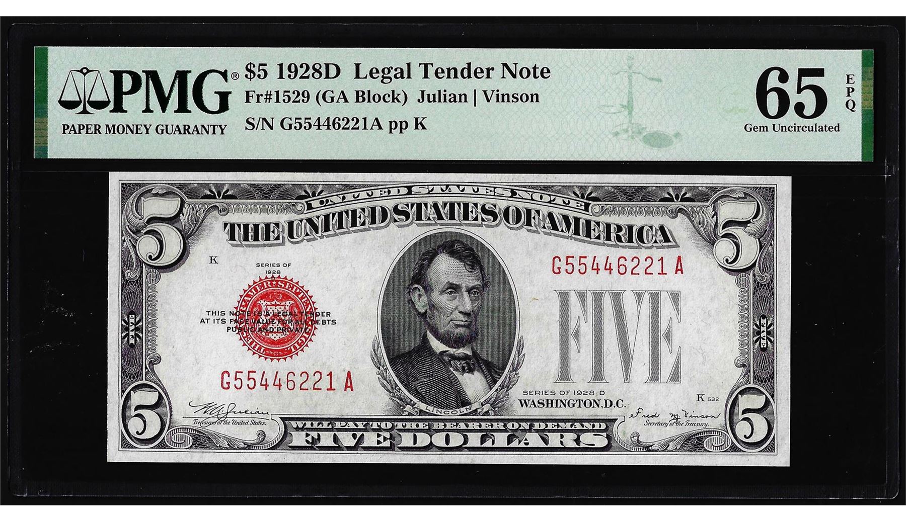 One 1928D $5 Legal Tender Note Fr.1529 PMG Gem Uncirculated 65EPQ. PMG Certified.