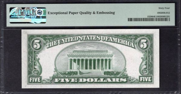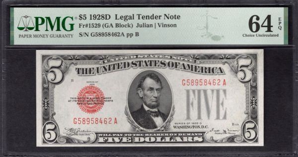 One 1928D $5 Legal Tender Note PMG 64EPQ.