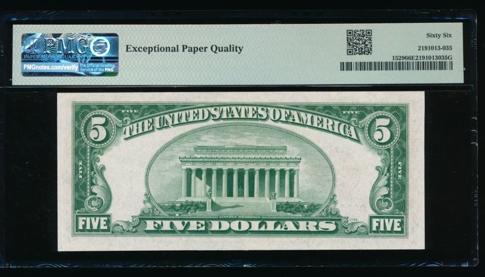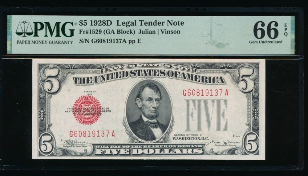One 1928D $5 Legal Tender Note PMG 66EPQ.