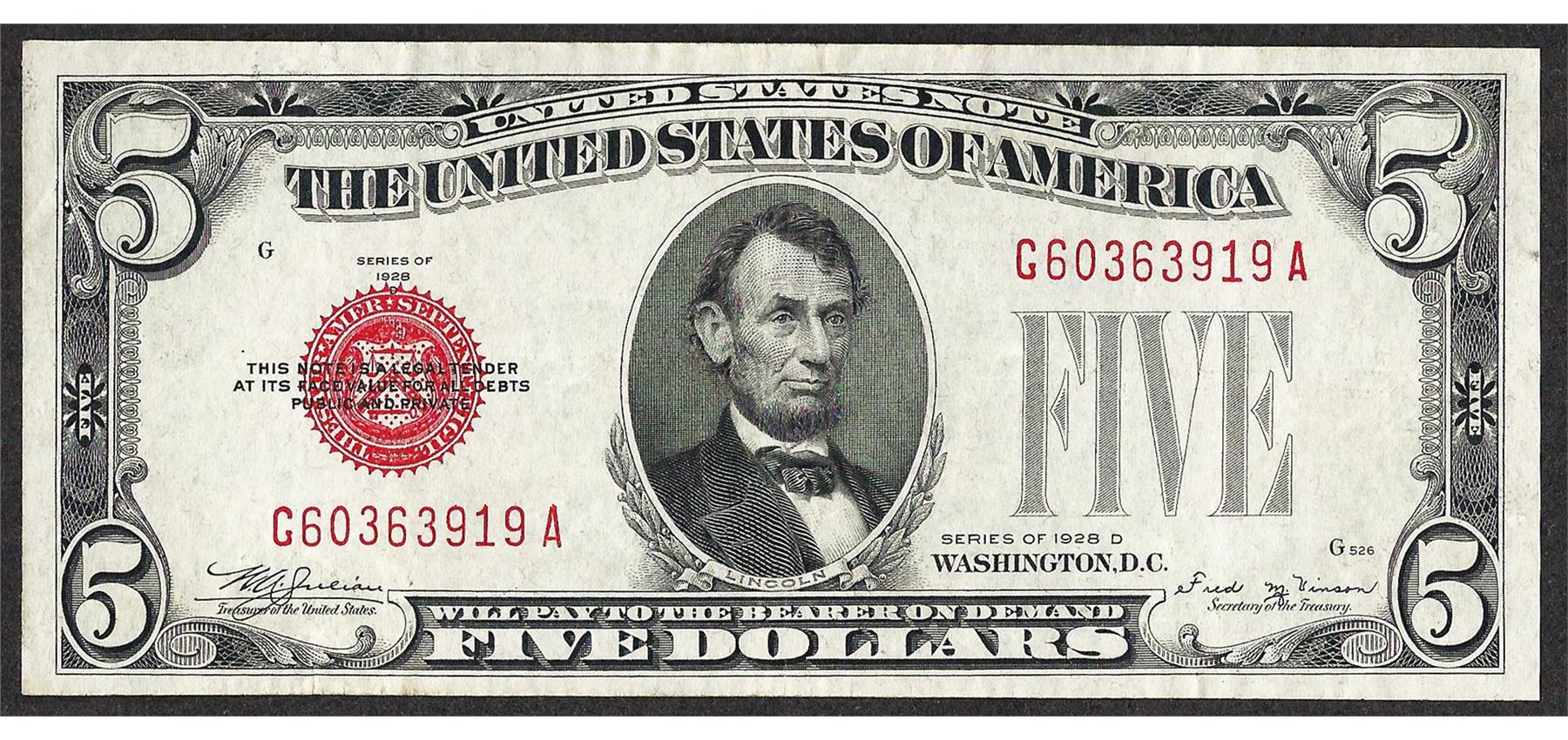 One 1928D $5 Legal Tender Note.