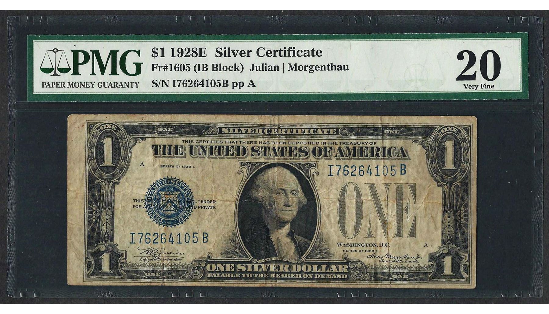One 1928E $1 Silver Certificate Note Fr.1605 PMG Very Fine 20. PMG Certified.