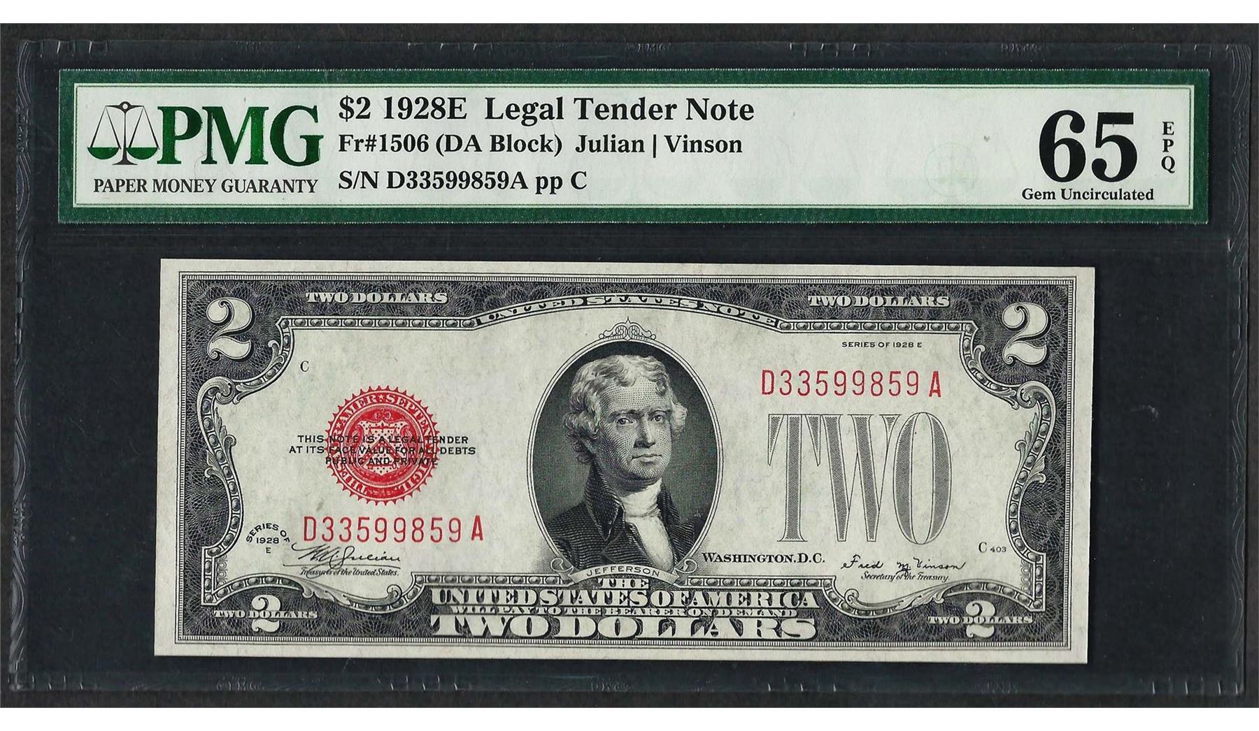 One 1928E $2 Legal Tender Note Fr.1506 PMG Gem Uncirculated 65EPQ.