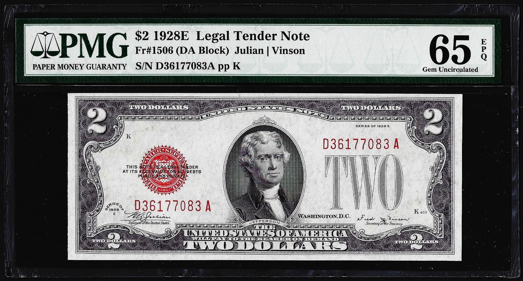 One 1928E $2 Legal Tender Note Fr.1506 PMG Gem Uncirculated 65EPQ.
