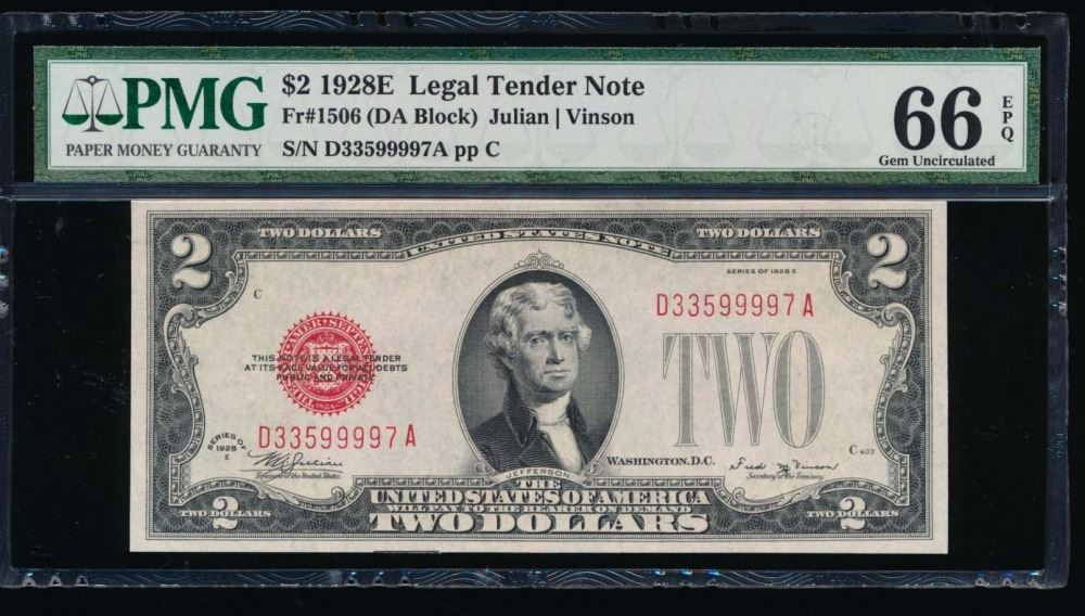 One 1928E $2 Legal Tender Note PMG 66EPQ.