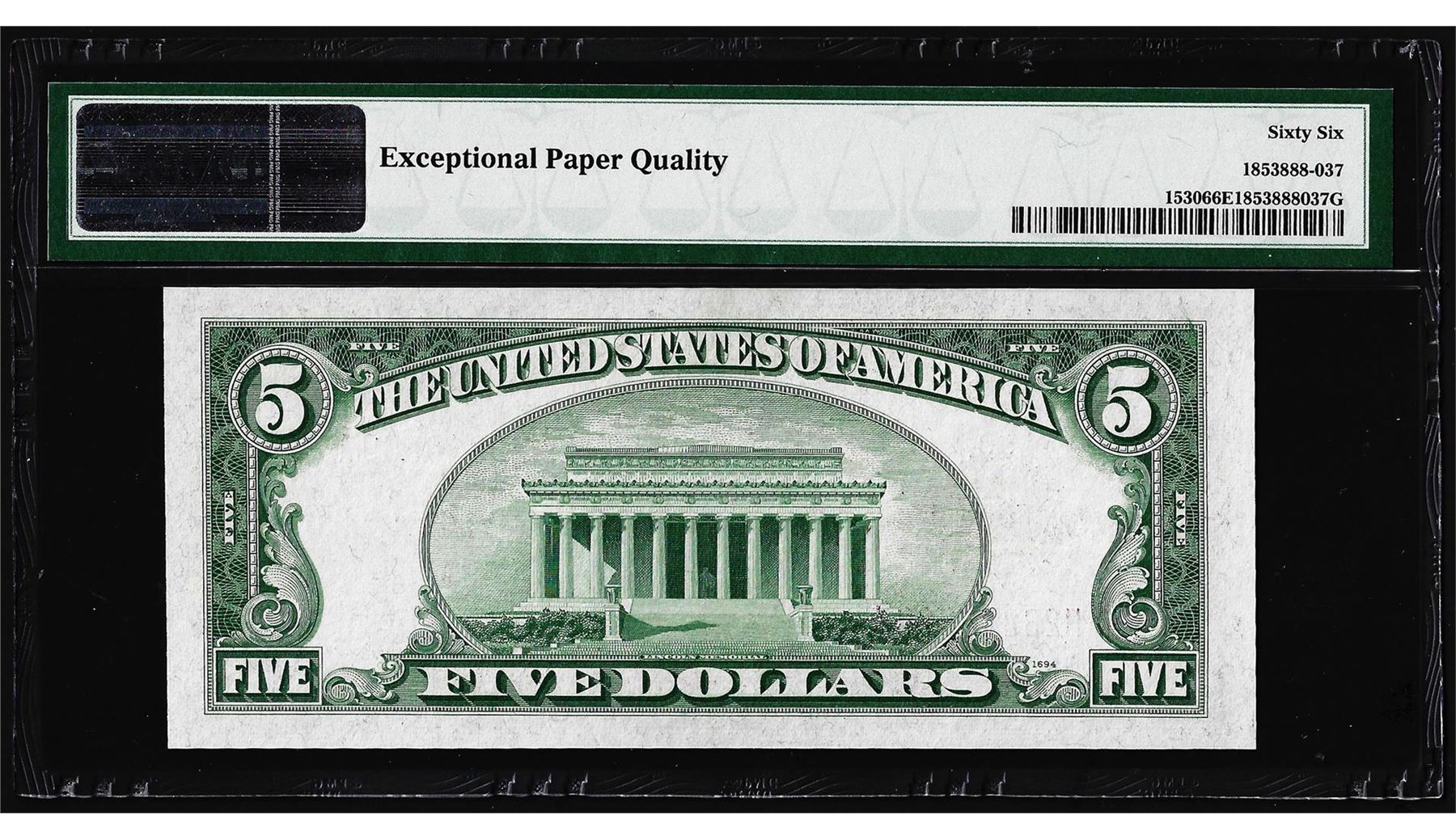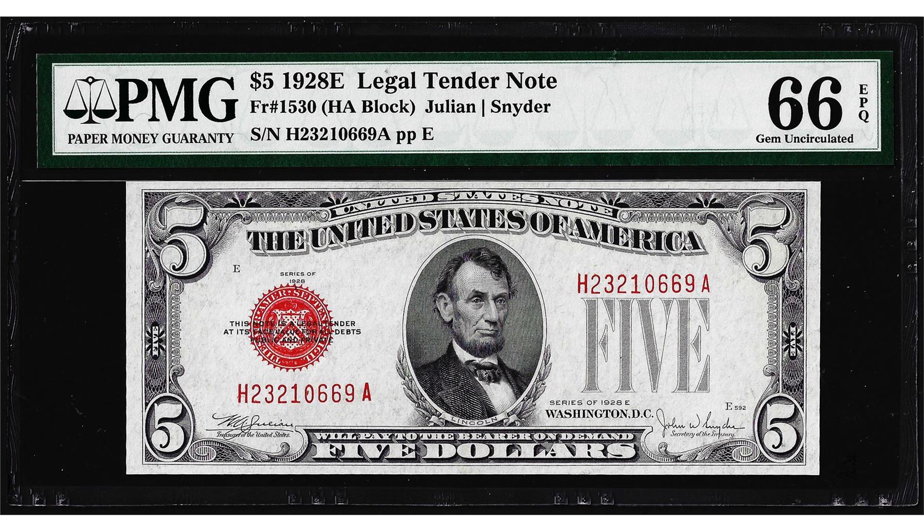 One 1928E $5 Legal Tender Note Fr.1530 PMG Gem Uncirculated 66EPQ. PMG Certified.