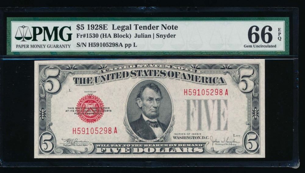 One 1928E $5 Legal Tender Note PMG 66EPQ.