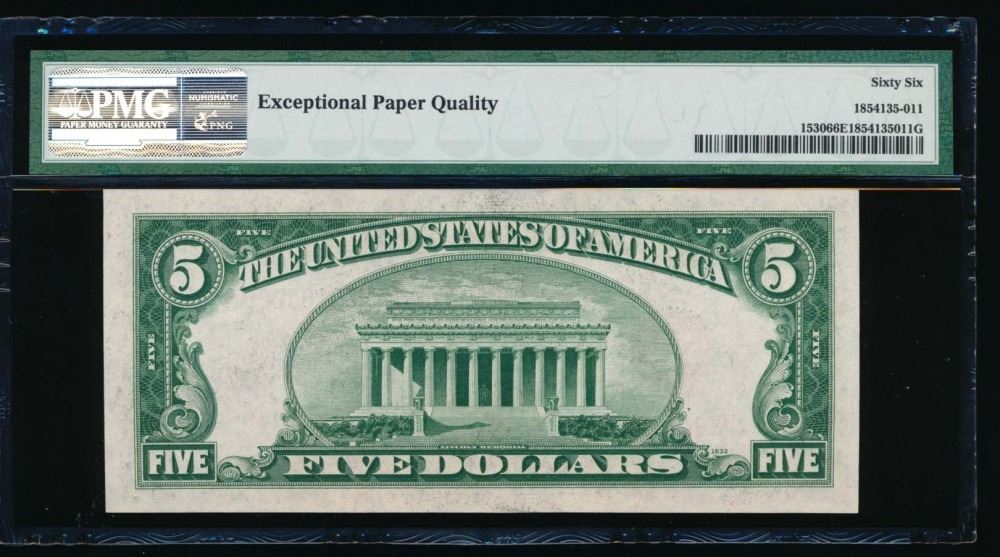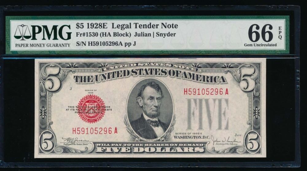 One 1928E $5 Legal Tender Note PMG 66EPQ.