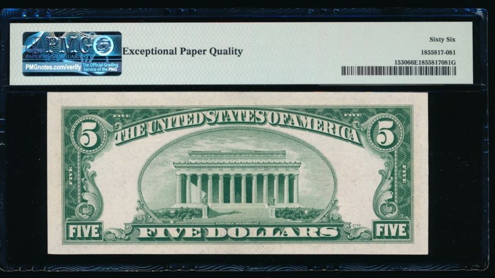 One 1928E $5 Legal Tender Note PMG 66EPQ.