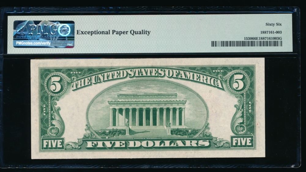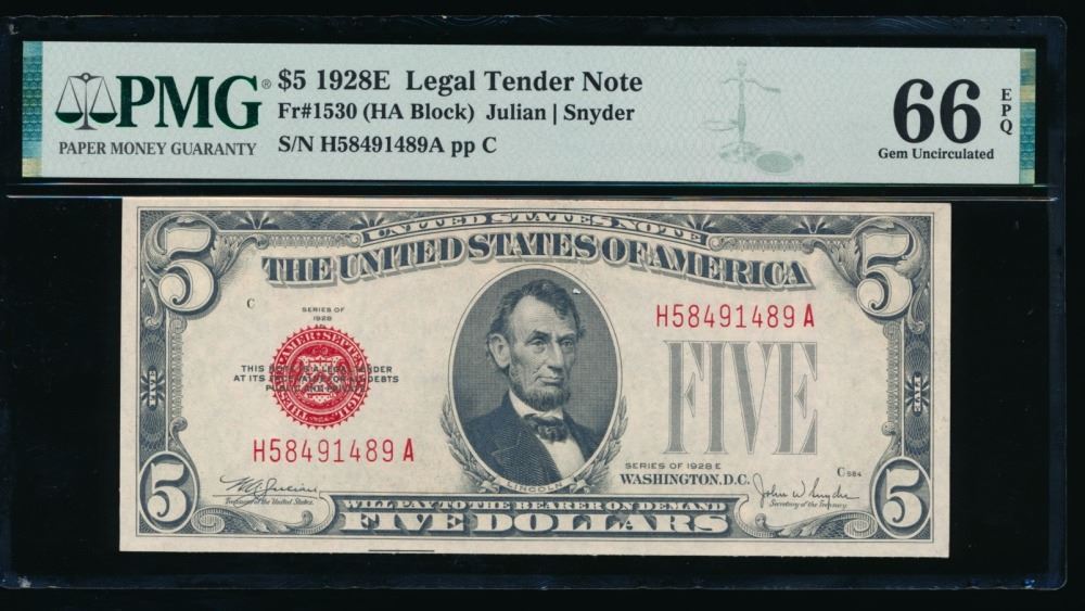 One 1928E $5 Legal Tender Note PMG 66EPQ.