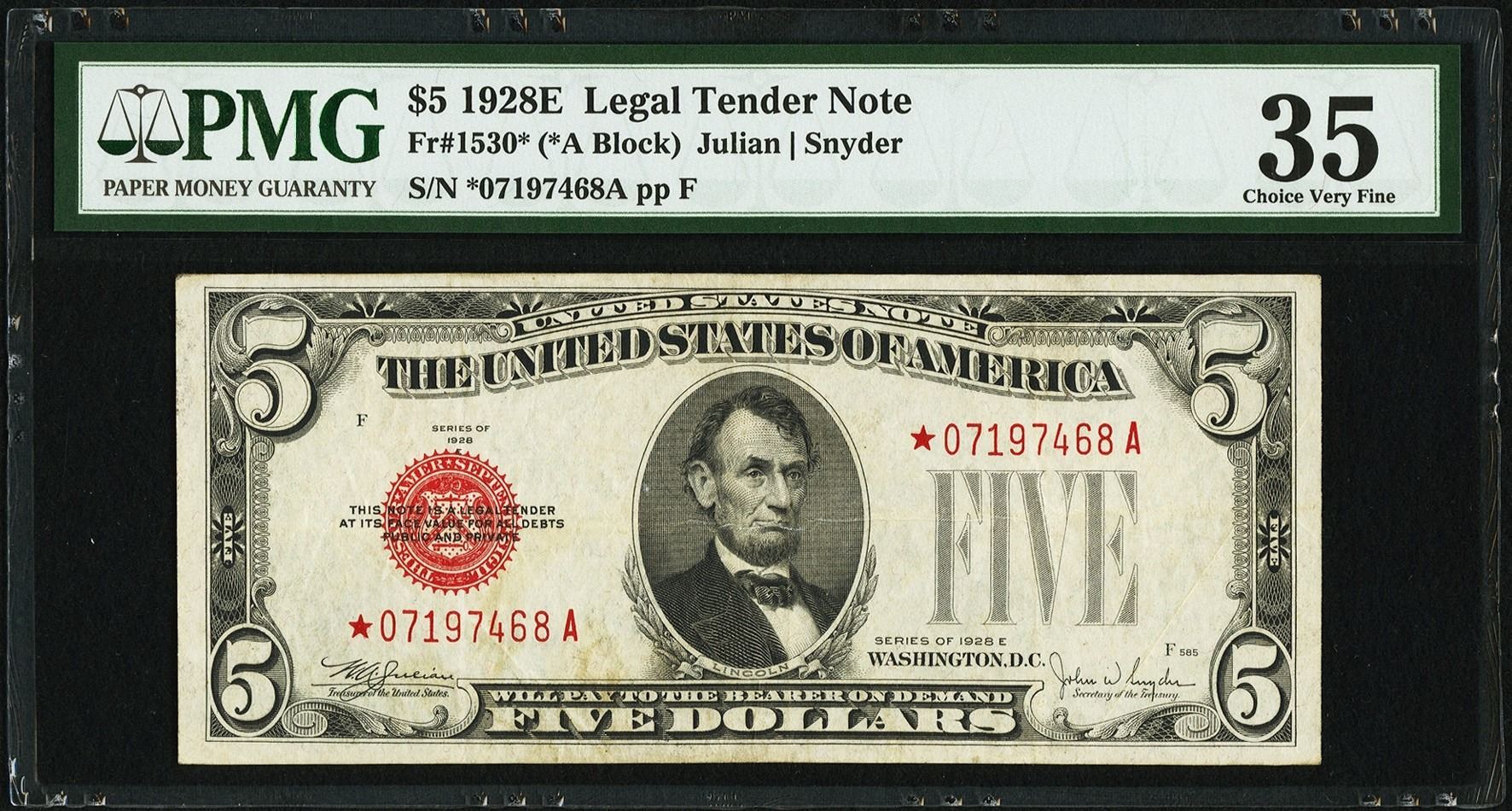 One 1928E $5 Legal Tender STAR Note PMG 35.