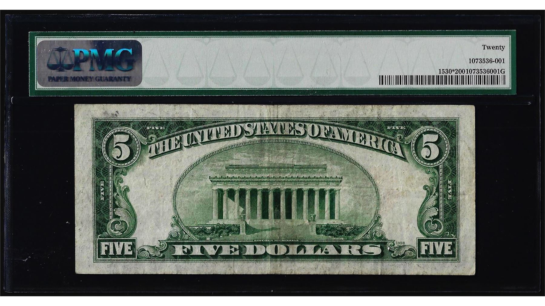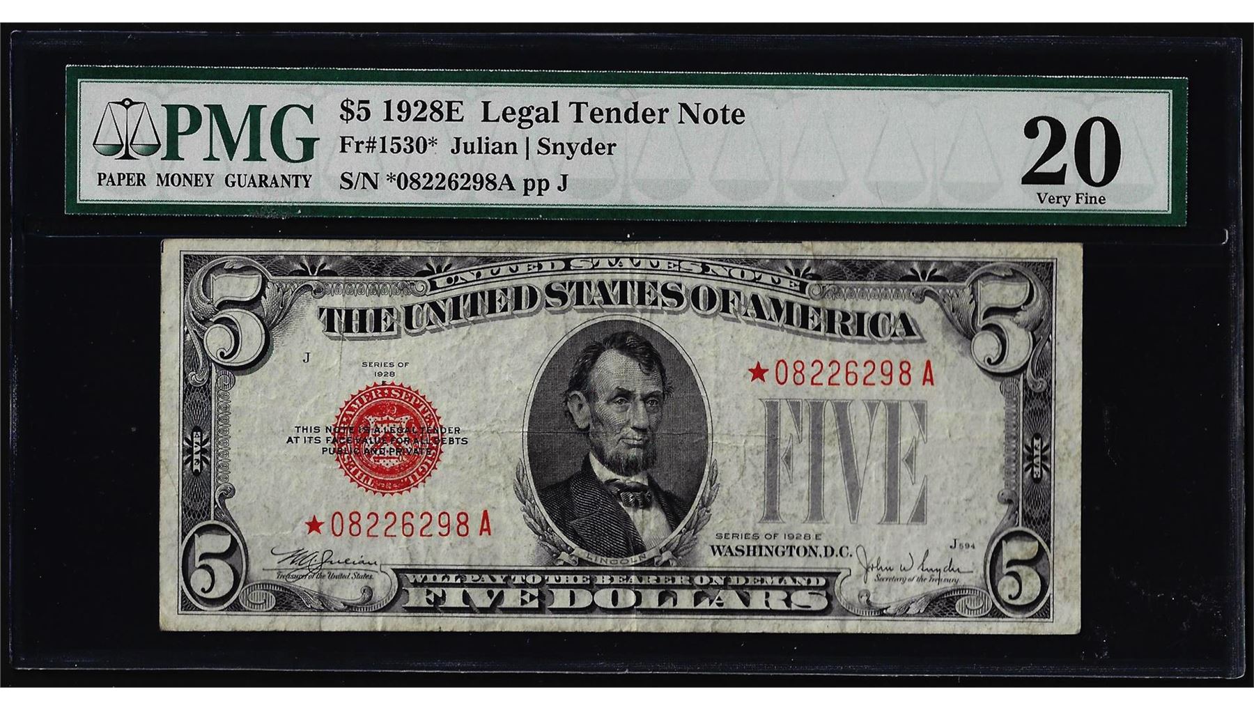 One 1928E $5 Legal Tender Star Note Fr.1530* PMG Very Fine 20. PMG Certified.