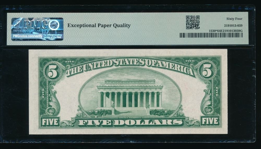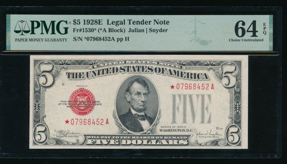 One 1928E $5 STAR Legal Tender Note PMG 64EPQ.