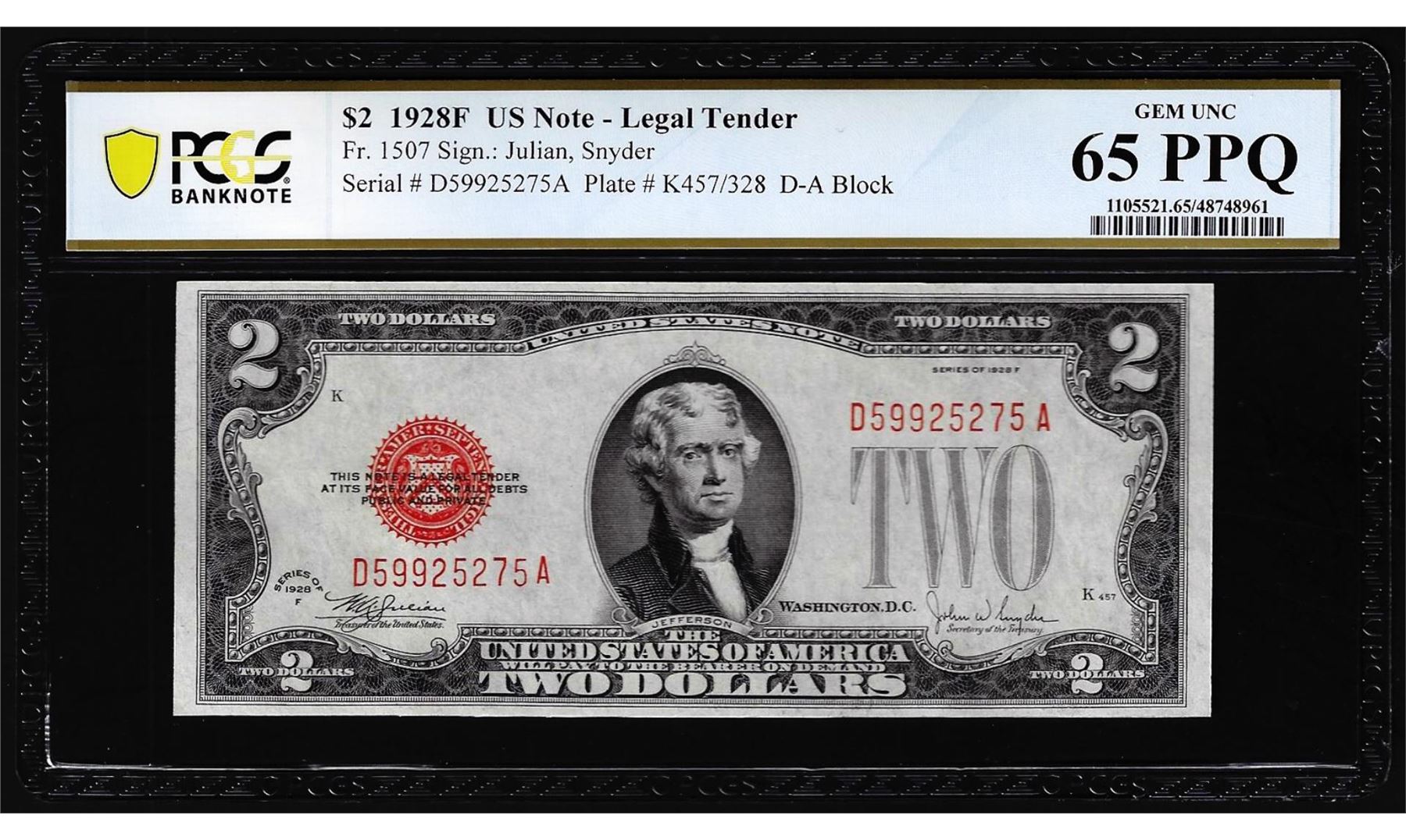 One 1928F $2 Legal Tender Note Fr.1507 PCGS Gem Uncirculated 65PPQ. PCGS Graded.