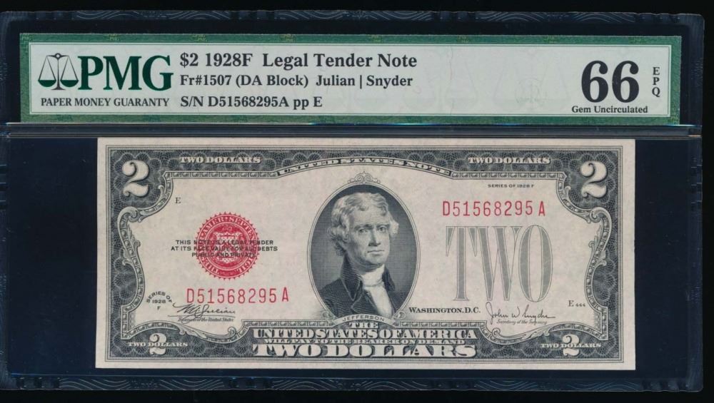 One 1928F $2 Legal Tender Note PMG 66EPQ.