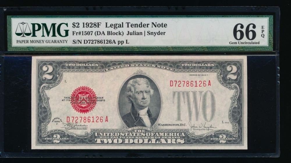 One 1928F $2 Legal Tender Note PMG 66EPQ.