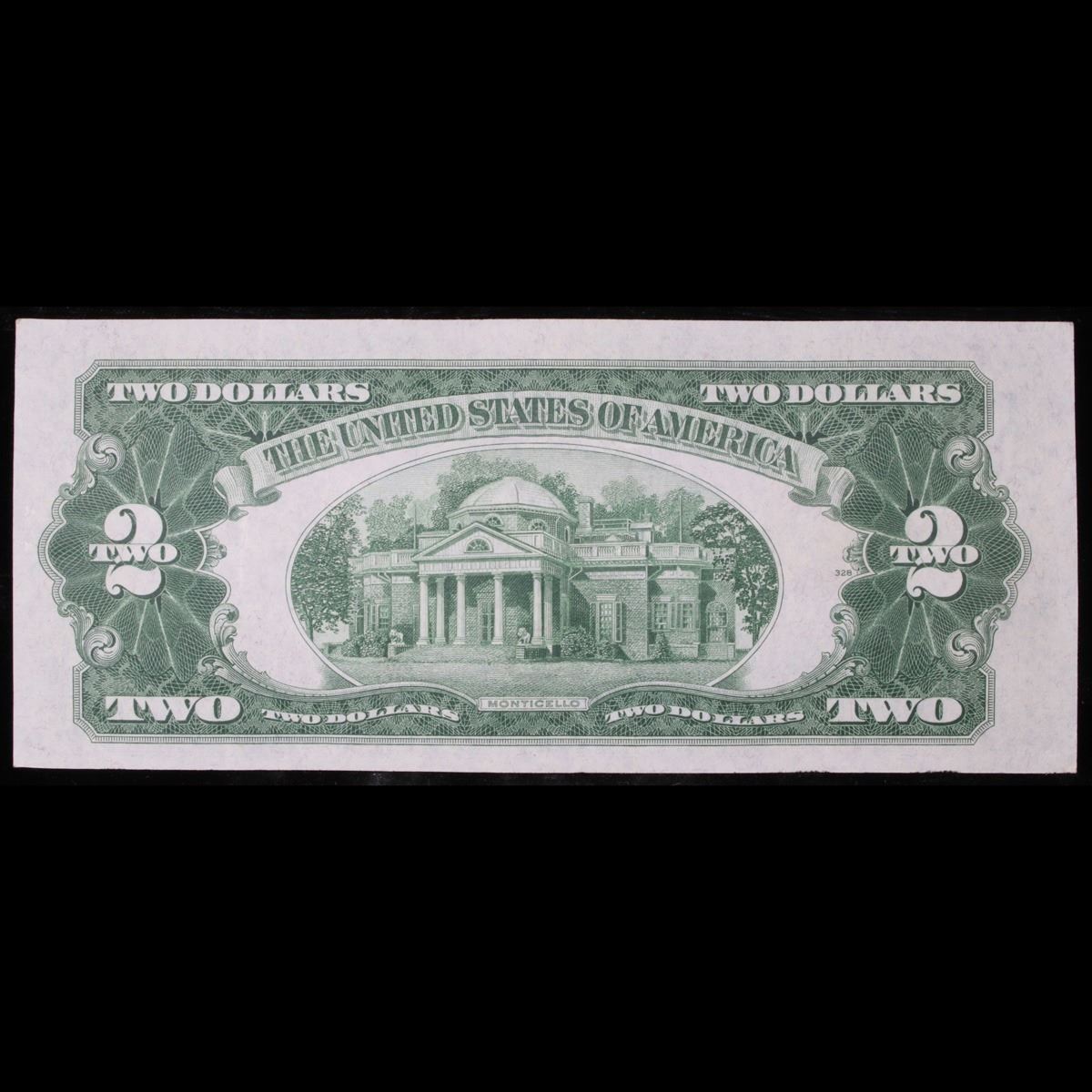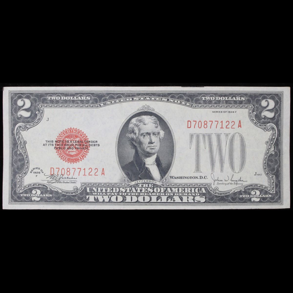 1928F $2 Red Seal United States Note Grades Choice AU/BU Slider. Like all red seal two dollar legal tender notes, the series of 1928F $2 notes features Thomas Jefferson on the front and Monticello on the back. Series of 1928G $2 bills were printed between June 1946 and May 1949. These dates coincide with when Fred M Vinson and John W Snyder were in office together.