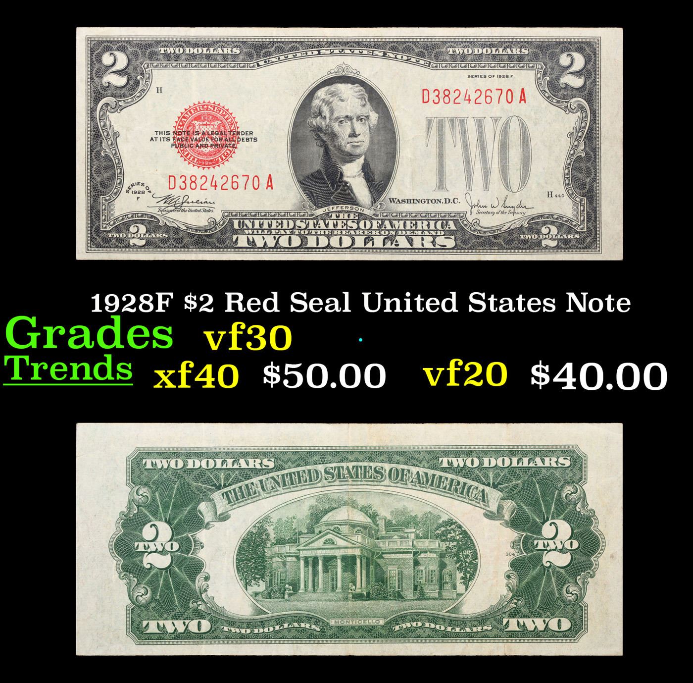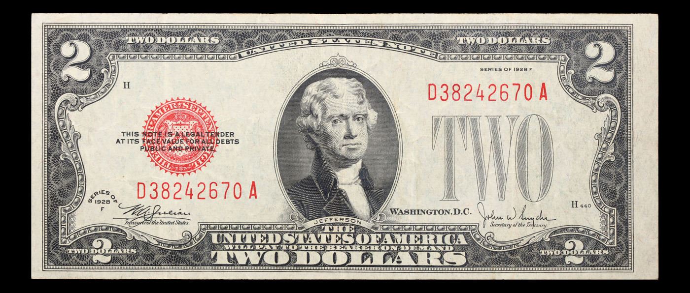 1928F $2 Red Seal United States Note Grades vf++. FR-1507 Two dollar bills from the series of 1928 are called 1928 $2 legal tenders. All legal tenders have a red seal. 1928 was also the first year that United States paper money was printed at its current size. Series of 1928 two dollar notes were the first series of three years to feature a red seal on that denomination. The other years are 1953 and 1963. The other two years are much more common. Series of 1928 two dollar red seals come in eight different types. 1928, 1928A, 1928B, 1928C, 1928D, 1928E, 1928G, and 1928F. 1928 two dollar bills are typically found today in very rough condition. Believe it or not, some are actually still in circulation. There can be nice premiums on truly uncirculated 1928 twos. trying to put together a choice uncirculated set will take some time and money.