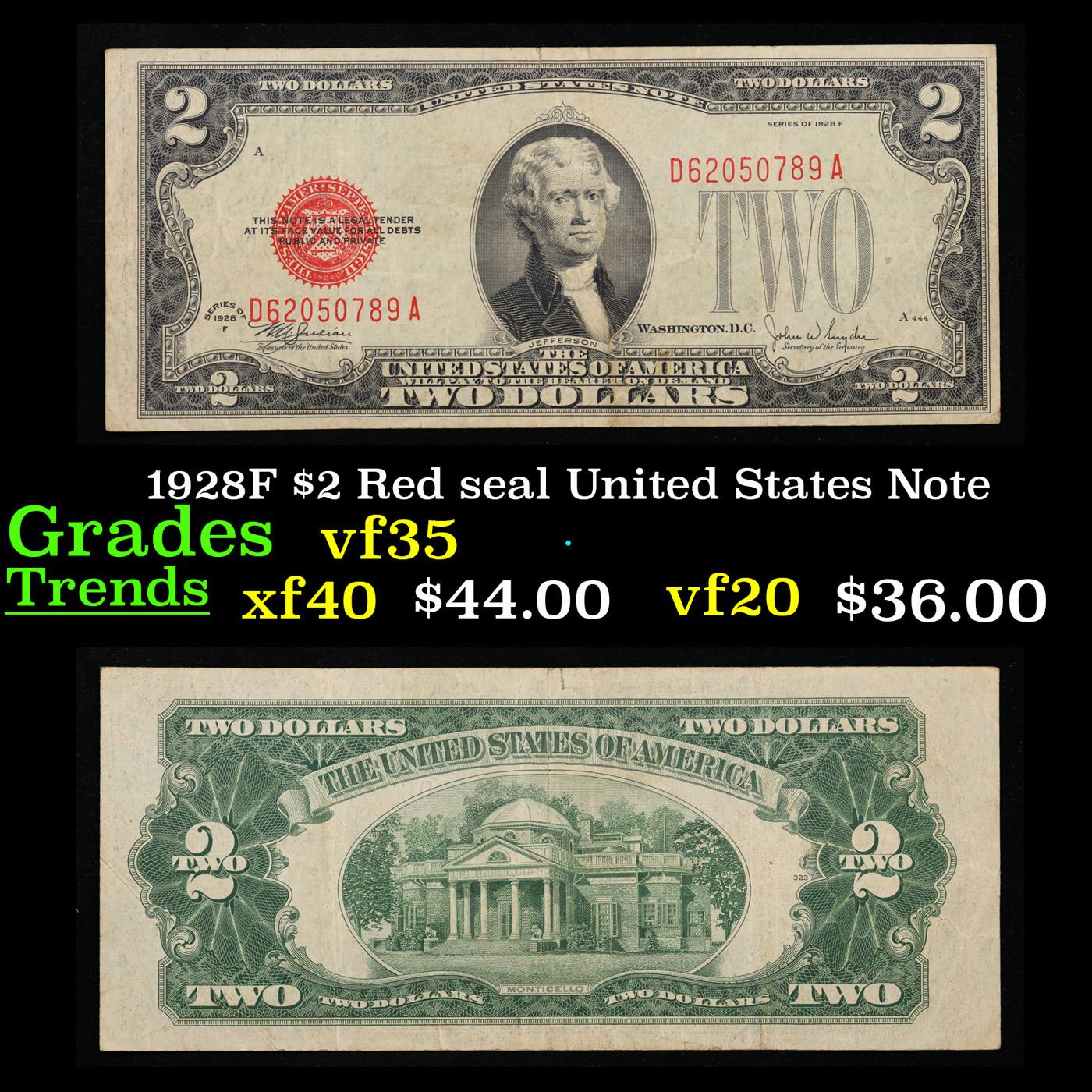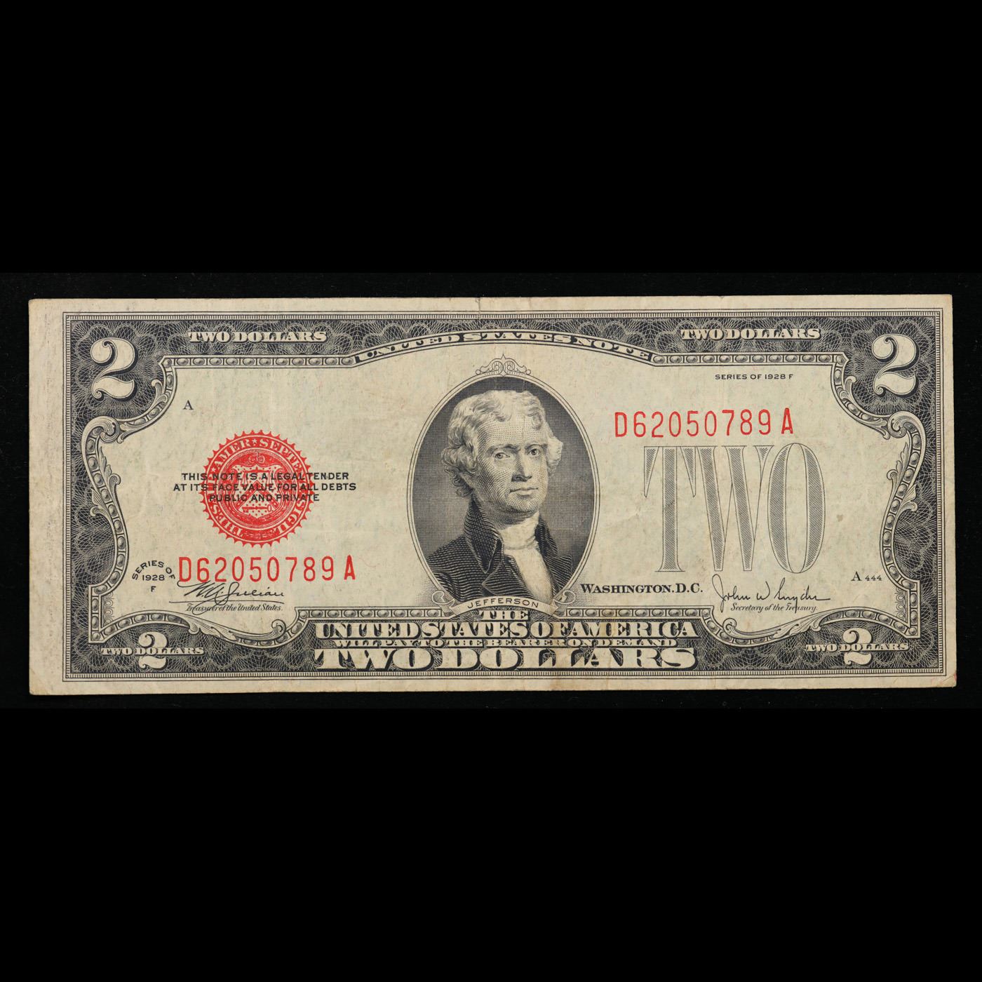 1928F $2 Red seal United States Note Grades vf++. This is the first “small size” two dollar bill issued by The U.S. In 1928 the size of paper money was changed to the size that we are familiar with today. Don’t let the old year fool you, 99% of these bank notes sell for around $5 each. Keep reading to learn about the exceptions. There are eight different types of 1928 $2 bills. They are Series of 1928, Series of 1928A, 1928B, 1928C, 1928D, 1928E, 1928F, and 1928G. Portarait of Thomas Jefferson. Signatures of Julian and Snyder