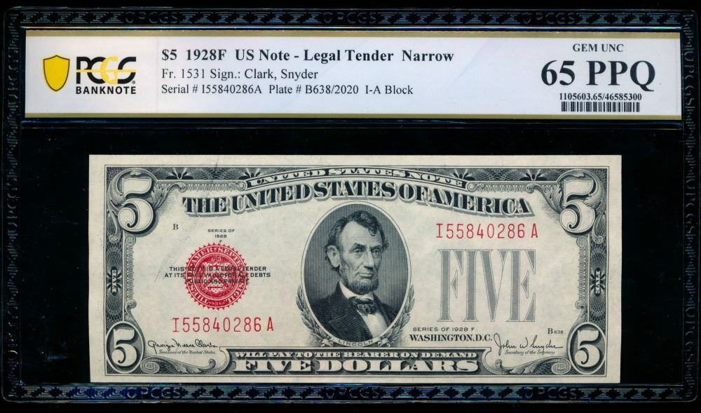 One 1928F $5 Legal Tender Note PCGS 65PPQ.
