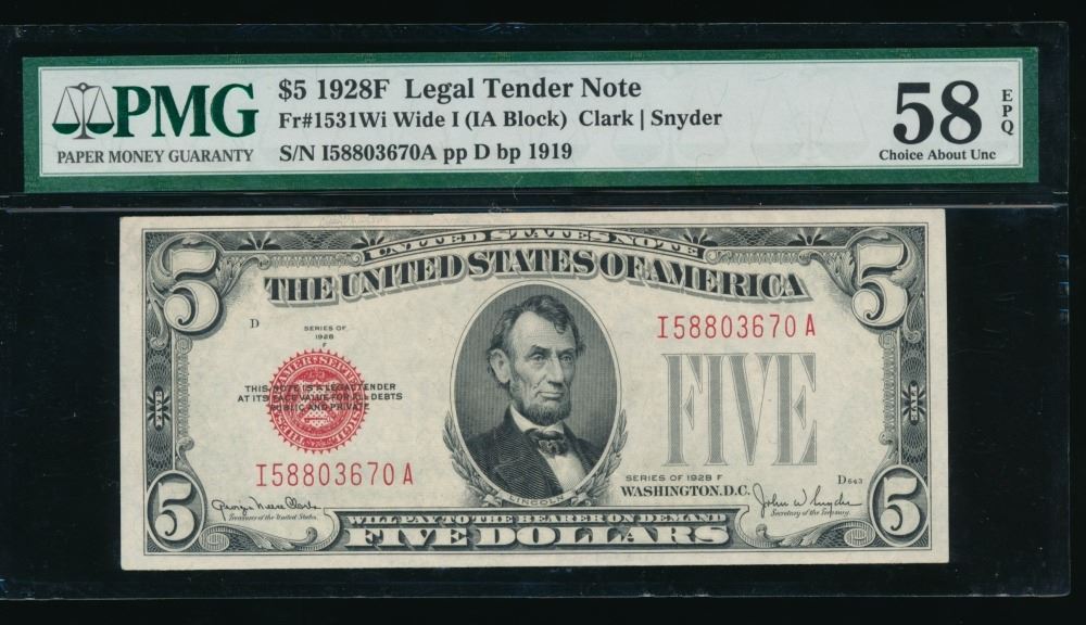 One 1928F $5 Legal Tender Note PMG 58EPQ.