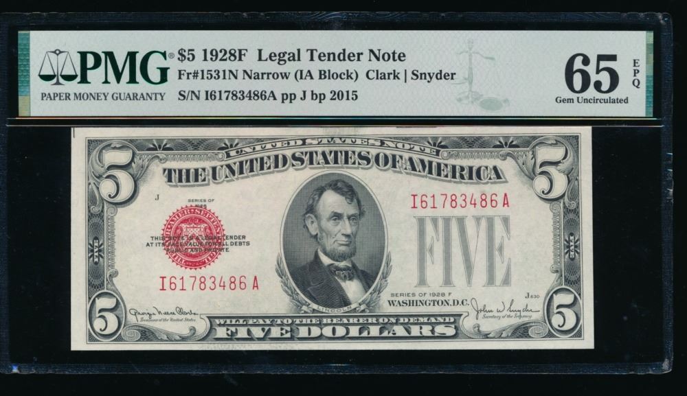 One 1928F $5 Legal Tender Note PMG 65EPQ.