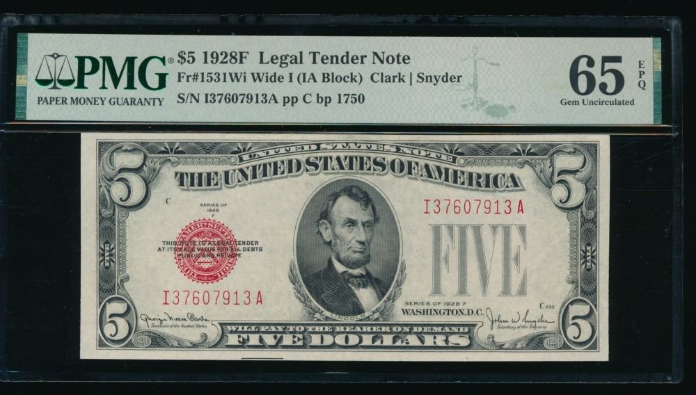 One 1928F $5 Legal Tender Note PMG 65EPQ.