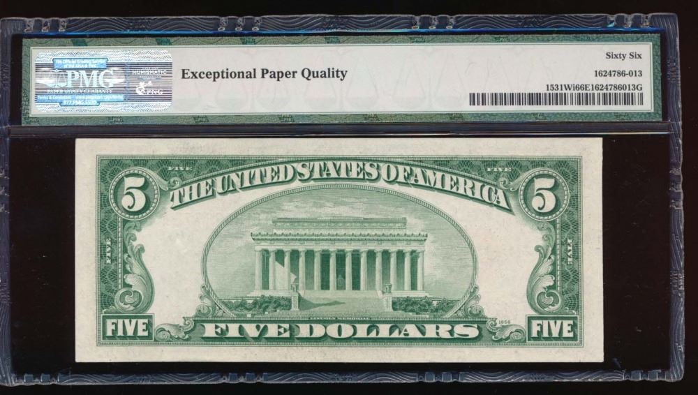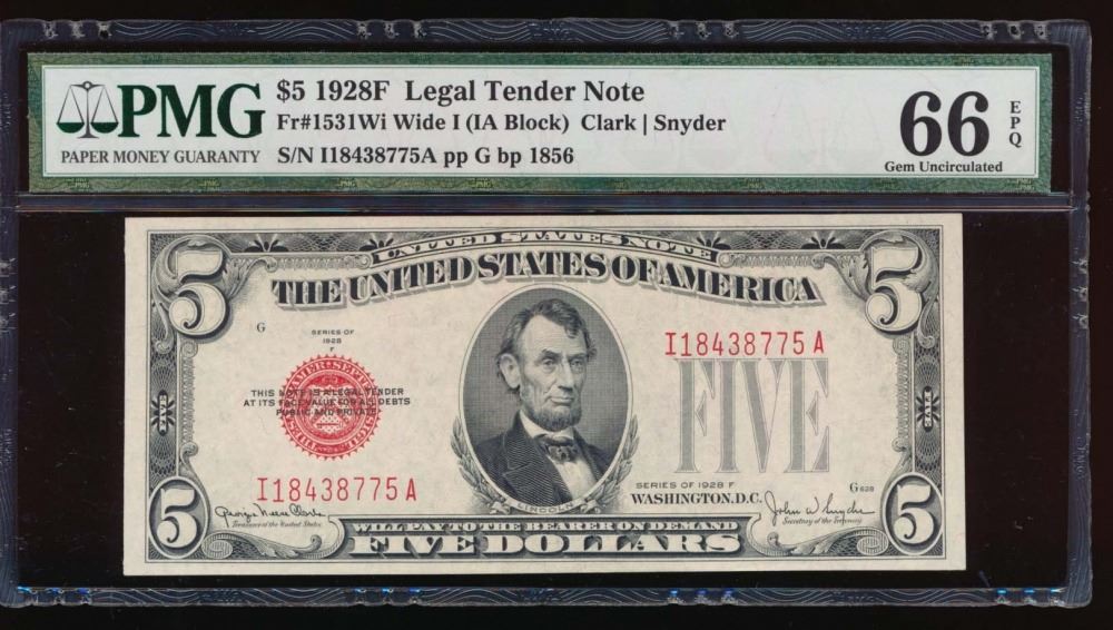 One 1928F $5 Legal Tender Note PMG 66EPQ.