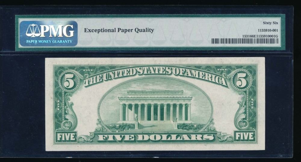 One 1928F $5 Legal Tender Note PMG 66EPQ.