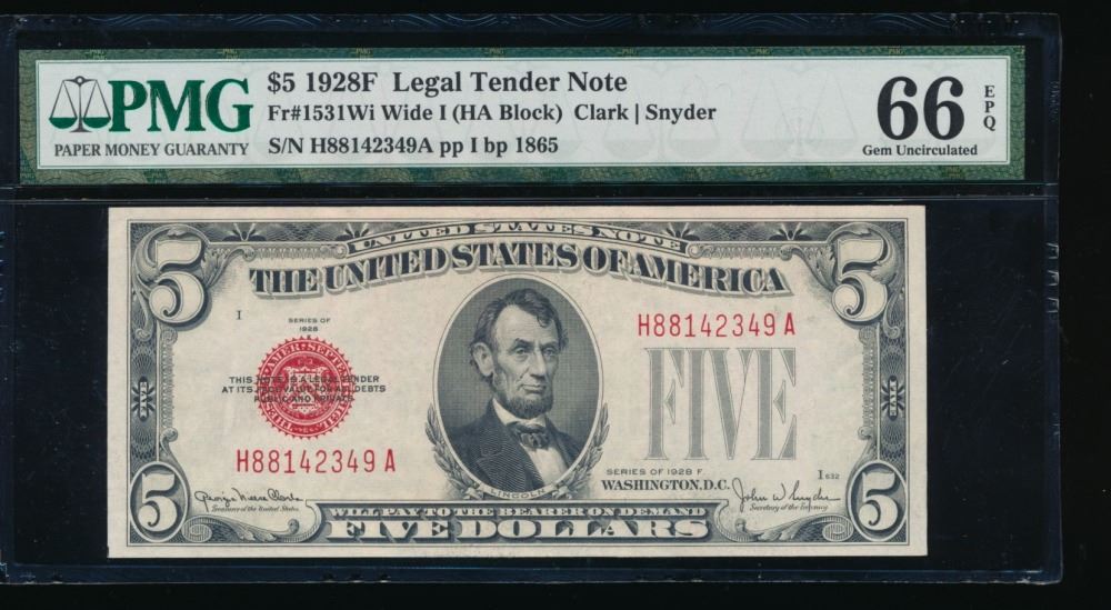 One 1928F $5 Legal Tender Note PMG 66EPQ.