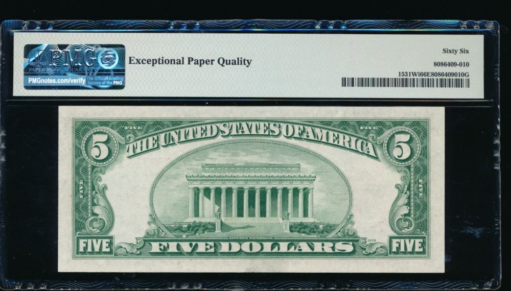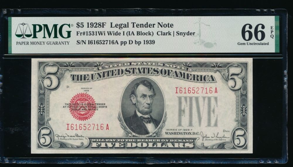 One 1928F $5 Legal Tender Note PMG 66EPQ.