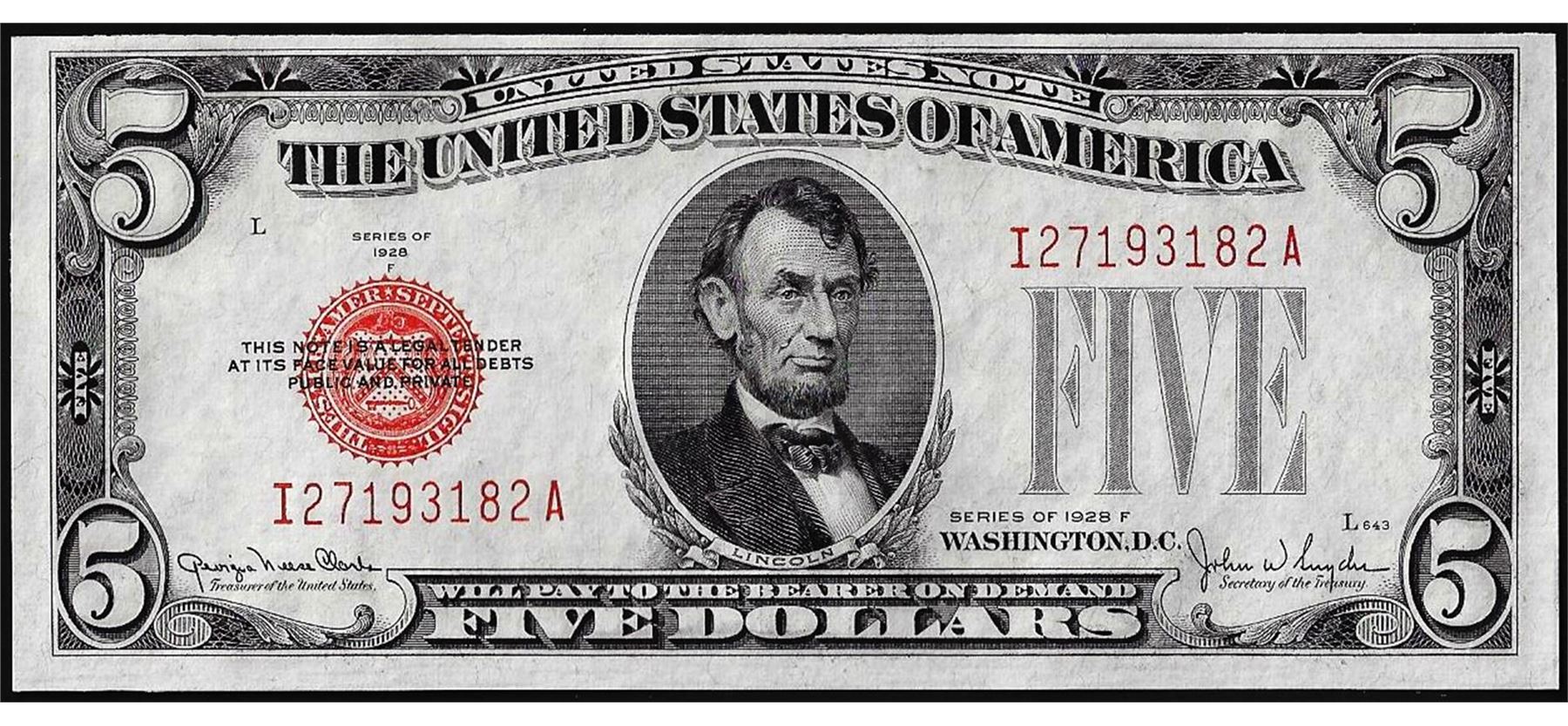 One 1928F $5 Legal Tender Note Red Seal.