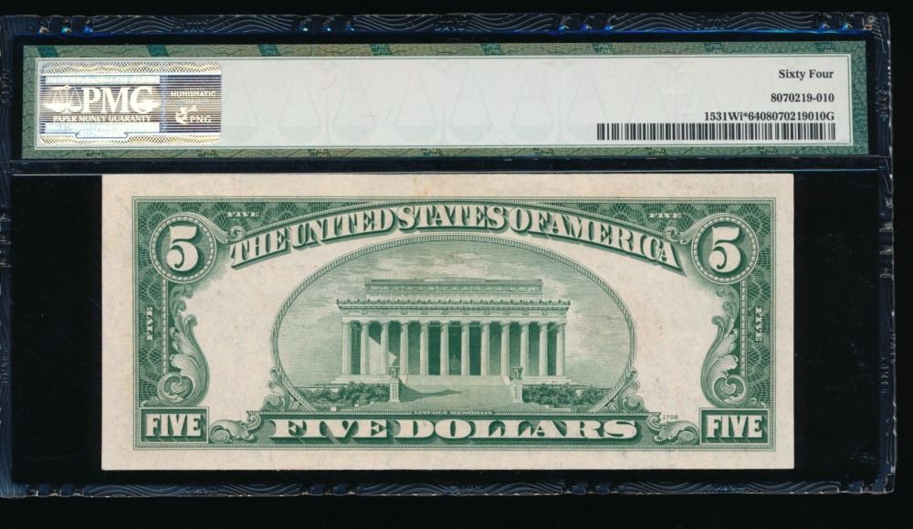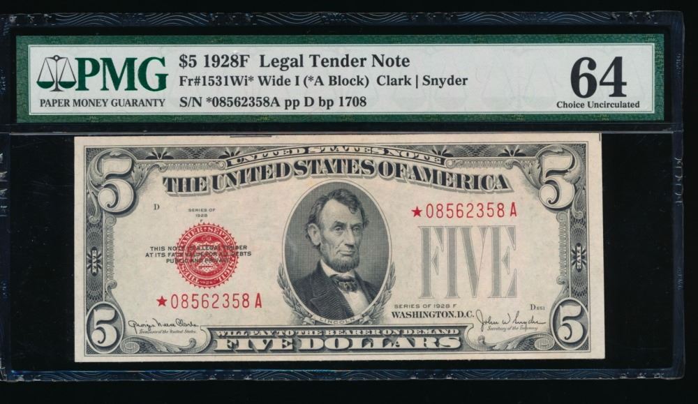 One 1928F $5 Legal Tender STAR Note PMG 64.