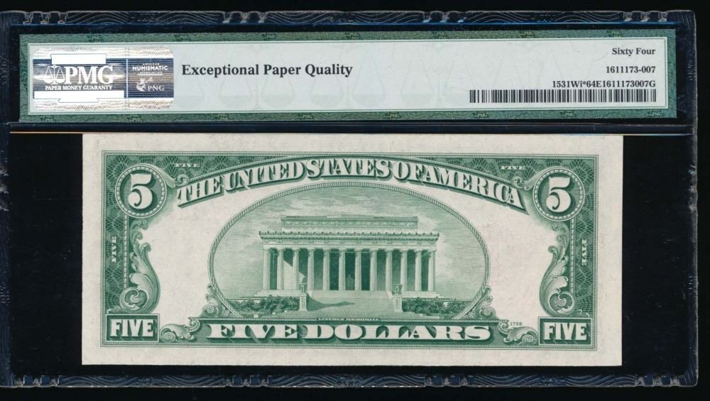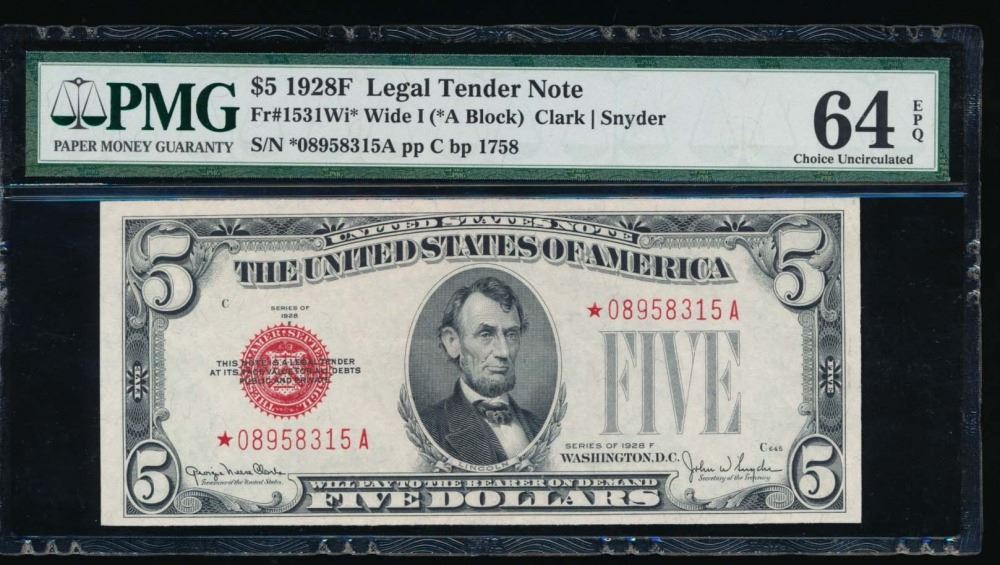 One 1928F $5 Legal Tender Star Note PMG 64EPQ.
