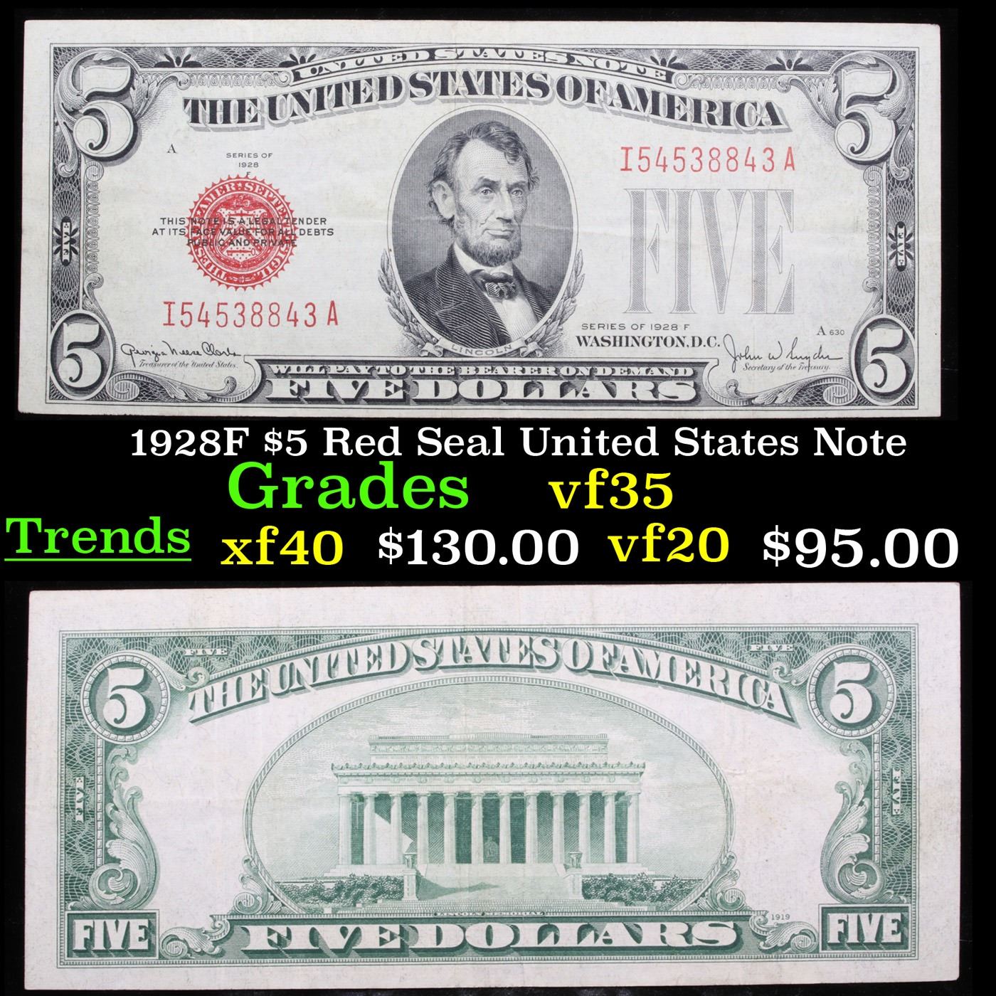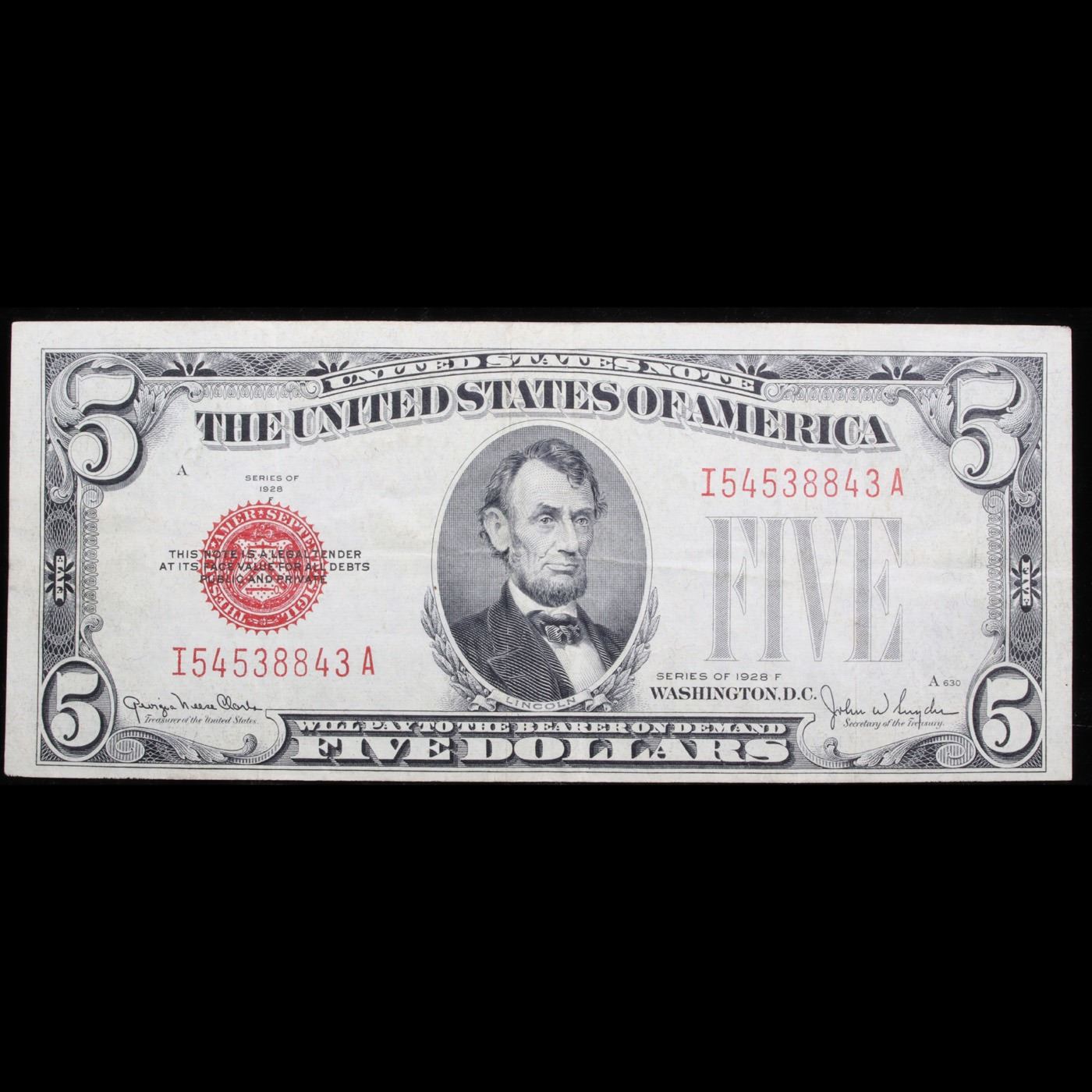 1928F $5 Red Seal United States Note Grades vf++ 1928 five dollar red seals say 1928, but they were printed for many years past just 1928. 1928Fs were printed as late as the early 1950s. Some 1928 five dollar bills have different phrasings. However, all 1928 fives have a portrait of Abraham Lincoln. All bills have a red seal on the left hand side of the bill. They also have red inked writing used for the serial numbers.