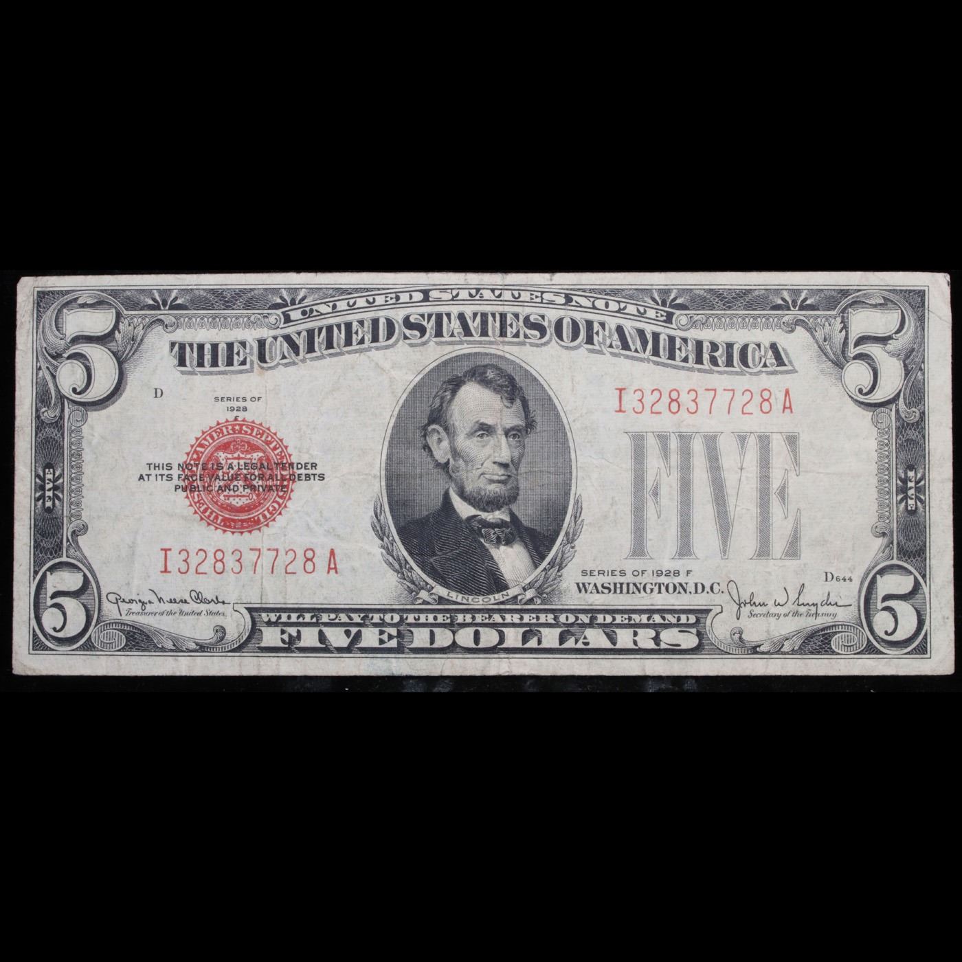 1928F $5 Red Seal United States Note Grades vf+. 1928 five dollar red seals say 1928, but they were printed for many years past just 1928. 1928Fs were printed as late as the early 1950s. Some 1928 five dollar bills have different phrasings. However, all 1928 fives have a portrait of Abraham Lincoln. All bills have a red seal on the left hand side of the bill. They also have red inked writing used for the serial numbers.