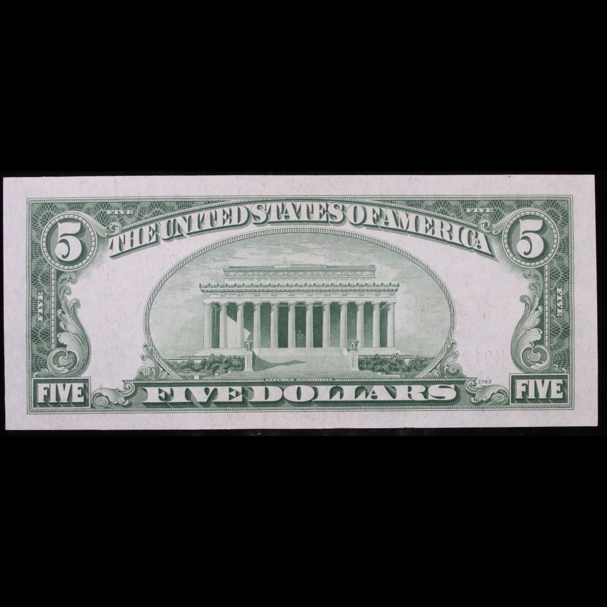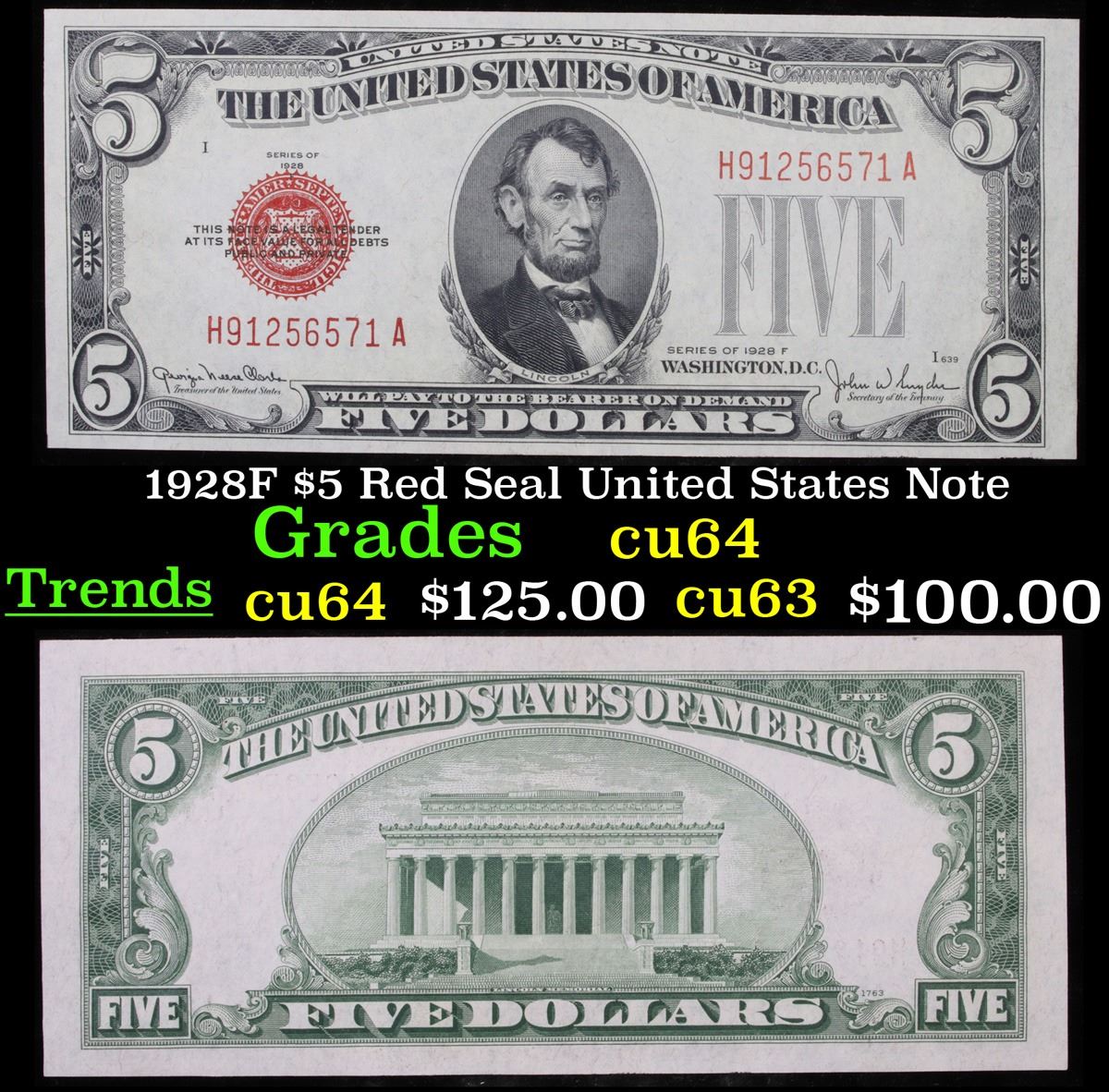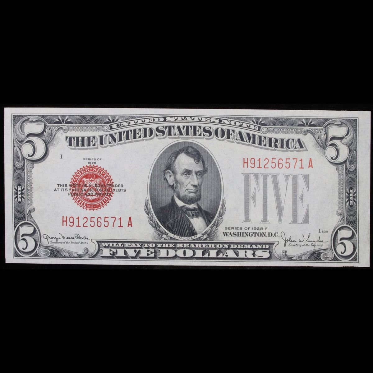 1928F $5 Red Seal United States Note Grades. 1928 five dollar red seals say 1928, but they were printed for many years past just 1928. 1928Fs were printed as late as the early 1950s. Some 1928 five dollar bills have different phrasings. However, all 1928 fives have a portrait of Abraham Lincoln. All bills have a red seal on the left hand side of the bill. They also have red inked writing used for the serial numbers.
