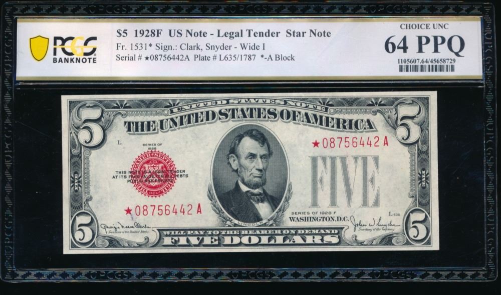 One 1928F $5 STAR Legal Tender Note PCGS 64PPQ.