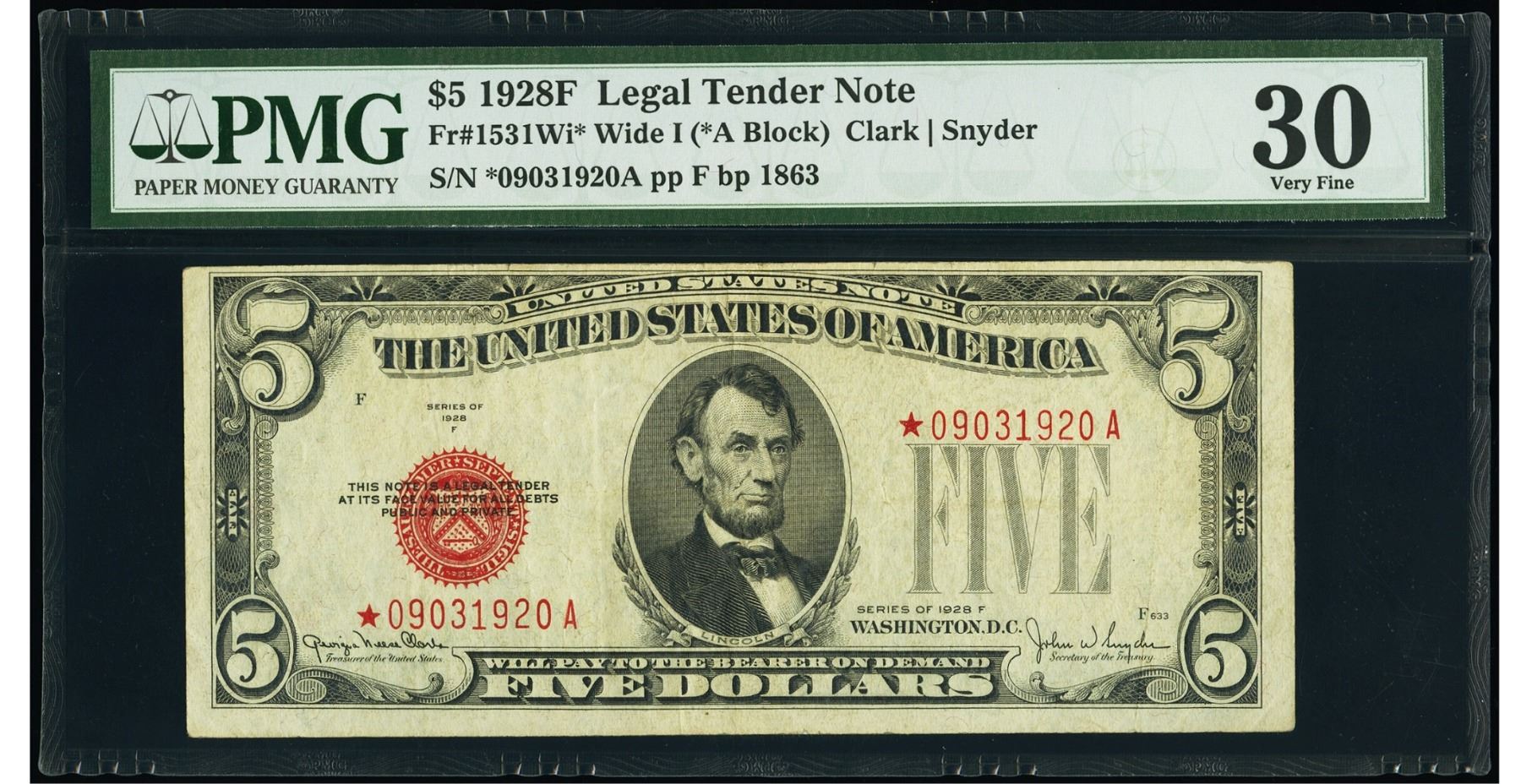 One 1928F $5 STAR Legal Tender Note PMG 30.
