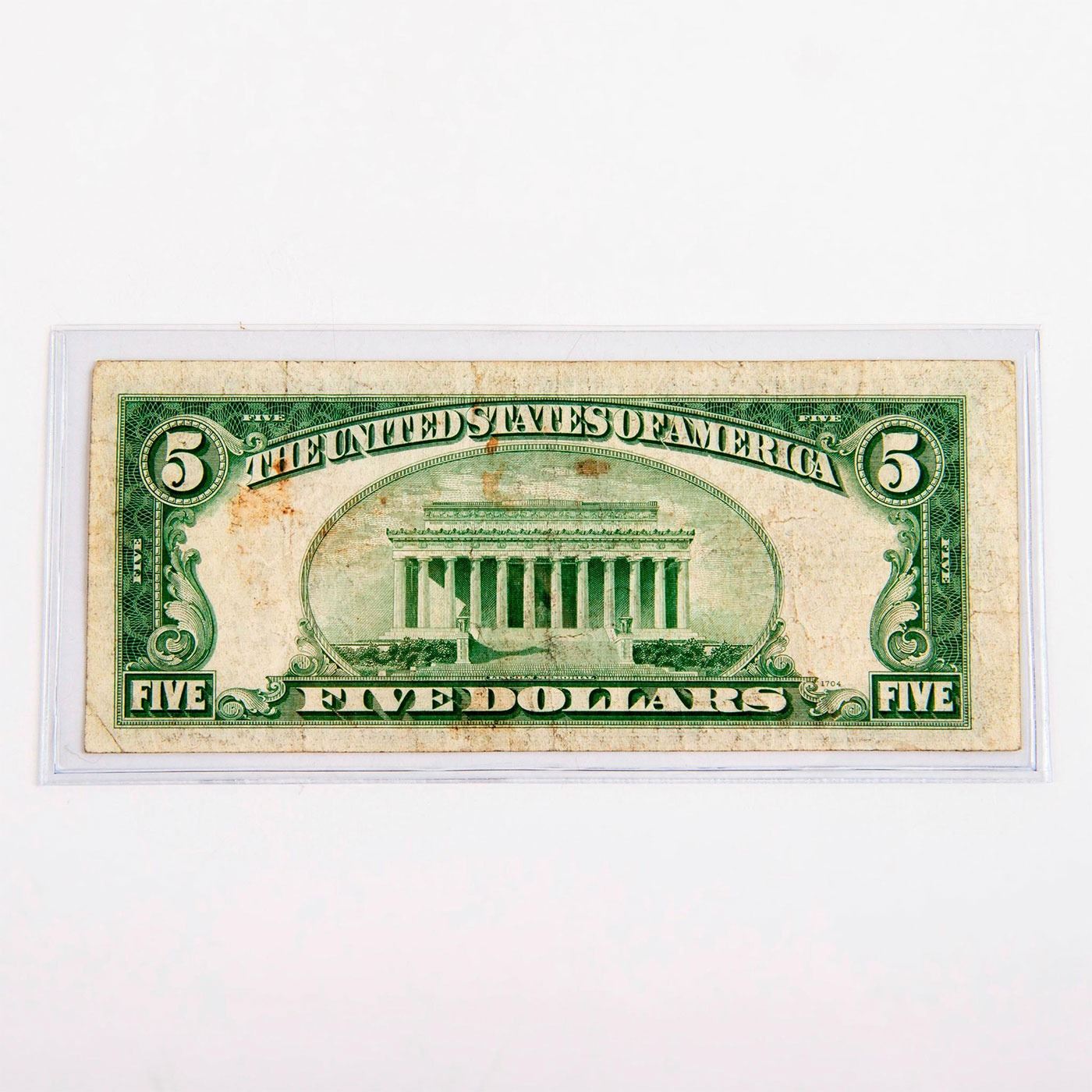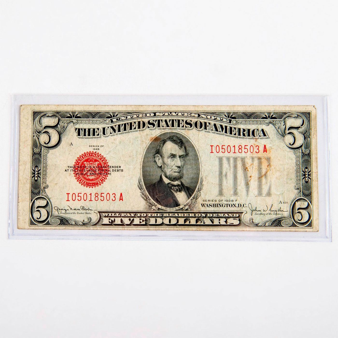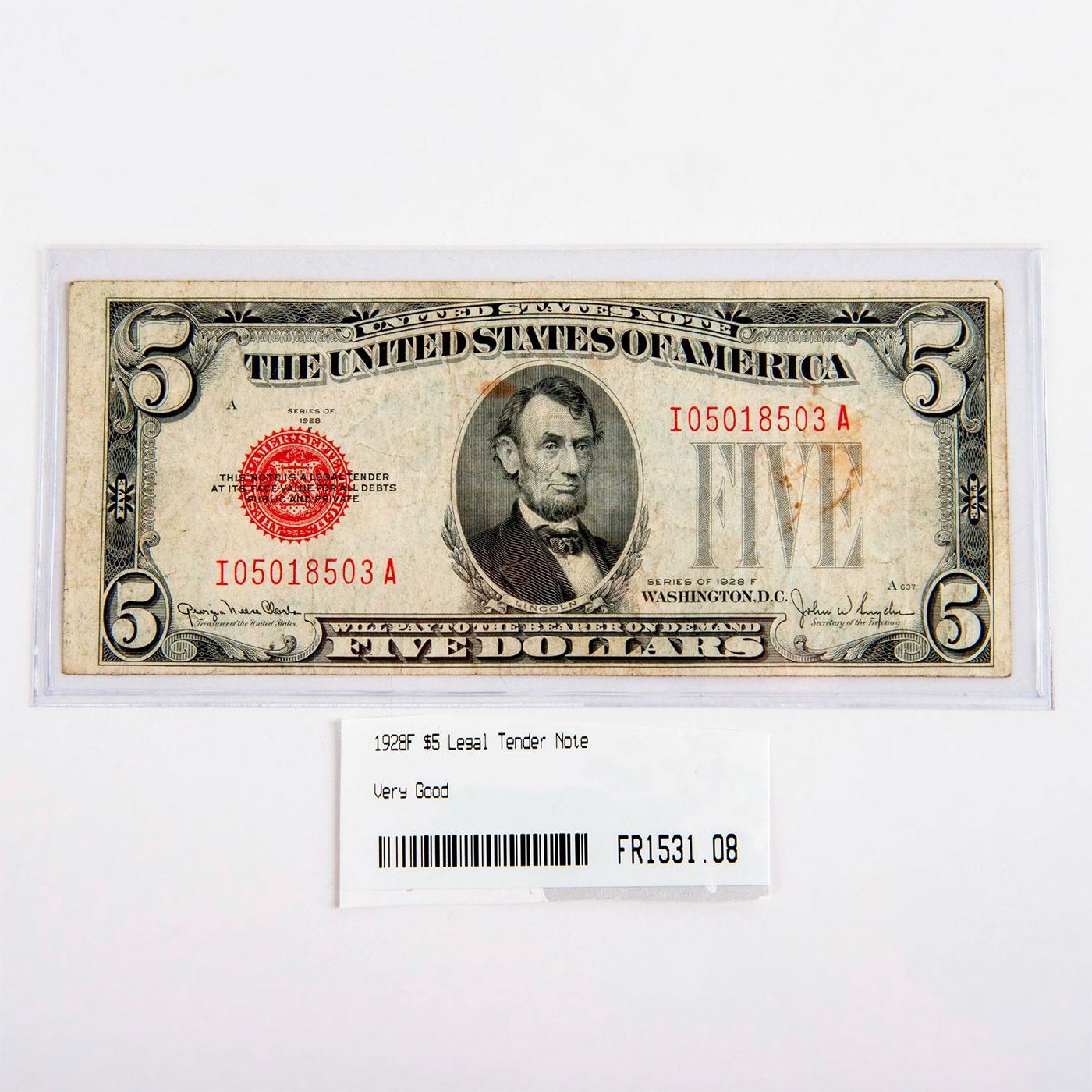 Very Good condition. The face of the small-size $5 Legal Tender Note features a central portrait of Abraham Lincoln, while the back depicts the Lincoln Memorial. 1928F $5 currency notes bear Julian-Morgenthau signatures, as well as the distinctive red seal and serial numbers unique to Legal Tender Notes. #Numismatists #coin #currency #AbrahamLincoln